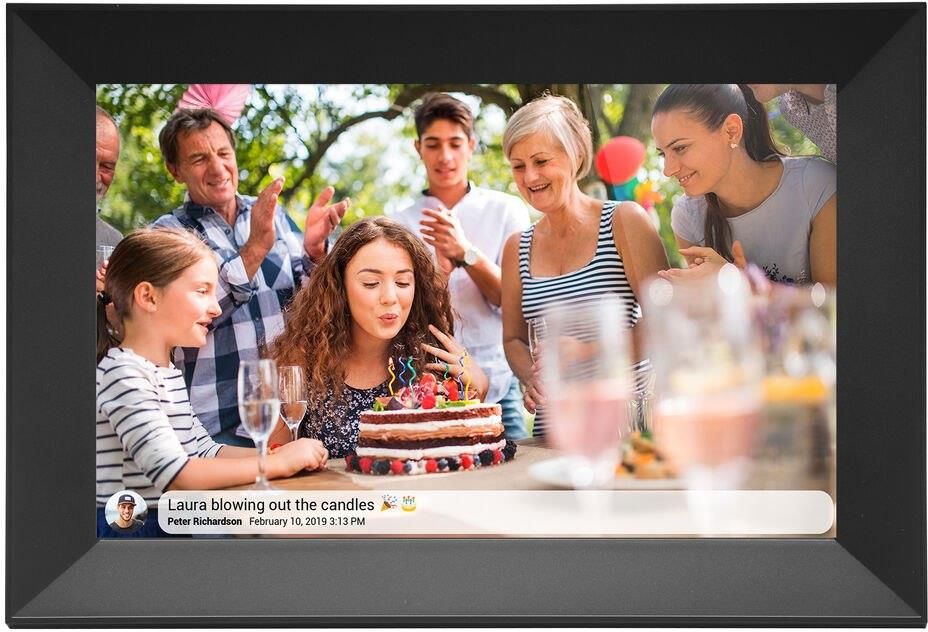 Denver Frameo PFF-1063 MKII czarny 25,4cm (10,1 ) 16GB Denver Denver Frameo PFF-1063 MKII - Cyfrowa Ramka Fotograficzna Denver Frameo PFF-1063 MKII to elegancka cyfrowa ramka fotograficzna o przekątnej 10,1 cala, która łączy w sobie nowoczesny design z funkcjonalnością. Dzięki wbudowanemu oprogramowaniu FRAMEO, dzielenie się zdjęciami i filmami z bliskimi nigdy nie było prostsze. Wyświetlacz FULL HD IPS o rozdzielczości 1920x1200 zapewnia wyraźne i żywe kolory. Wbudowane oprogramowanie FRAMEO umożliwia personalizację ramki oraz łatwe przesyłanie zdjęć i filmów. Możliwość dodawania tekstu do zdjęć, co nadaje im osobisty charakter. Funkcja rotacji zdjęć z możliwością ustawienia czasu wyświetlania od 10 sekund do 30 minut. Automatyczne wyłączanie ramki w nocy dzięki funkcji timera. 16 GB pamięci wewnętrznej pozwala na przechowywanie tysięcy zdjęć. Slot na kartę microSD umożliwia łatwe importowanie zdjęć z zewnętrznych nośników. Obsługuje połączenia Wi-Fi w dwóch pasmach (2.4 GHz i 5 GHz) dla stabilnego przesyłania danych. Najważniejsze dane Przekątna ekranu: 25,4 cm (10,1 cala) Rozdzielczość: 1920 x 1200 pikseli Pamięć wewnętrzna: 16 GB Typ złącza kart pamięci: microSD (do 32 GB) Wymiary (Szer. x Wys. x Gł.): 264 x 183 x 23 mm Kolor: czarny Głośniki: tak Ekran dotykowy: tak Klasa efektywności energetycznej: E