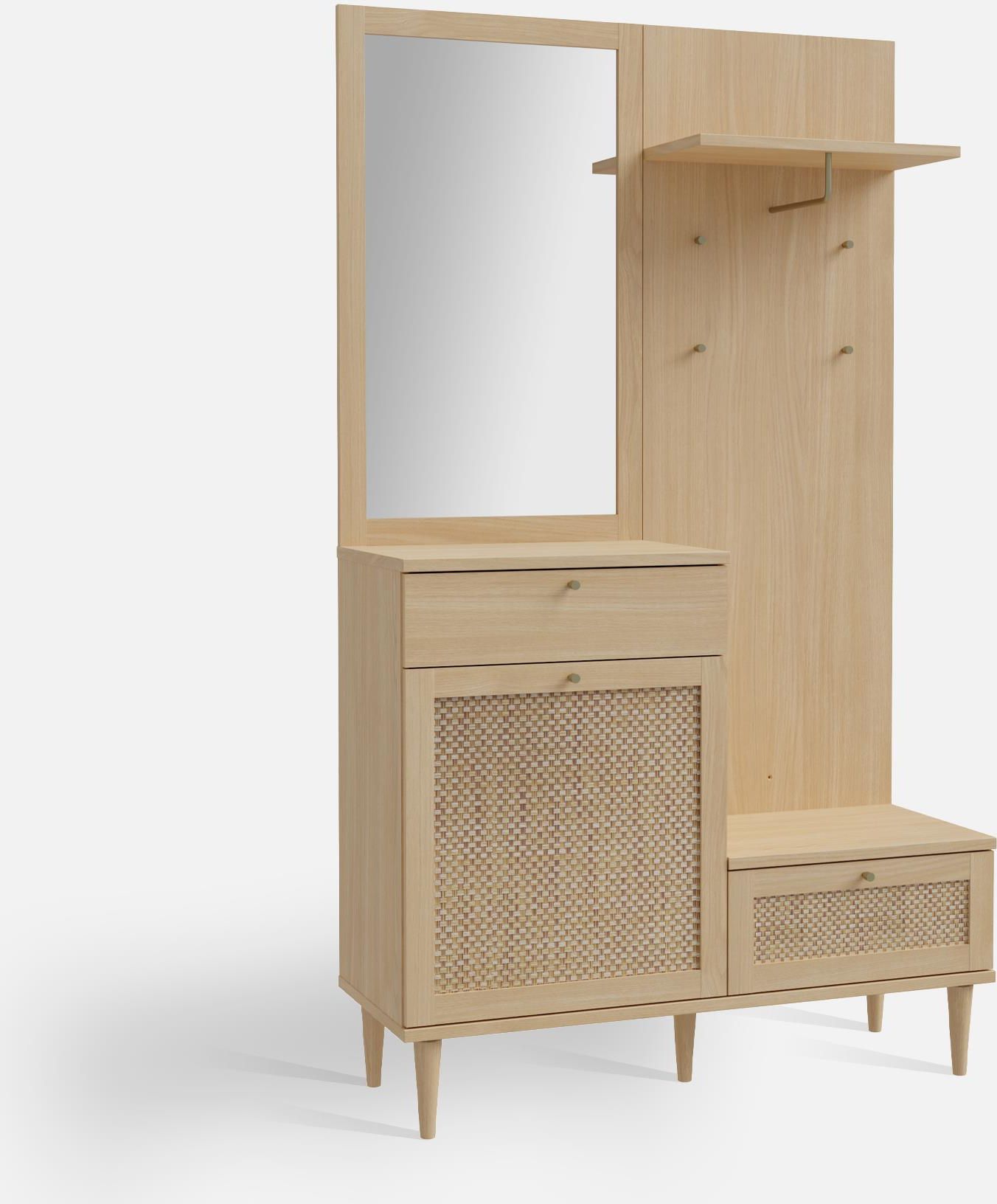Z zestawem CALASETTA utrzymanie porządku w przedpokoju stanie się łatwe i przyjemne. Kurtki i płaszcze odwiesisz na haczykach lub drążku ubraniowym. Torbę odłożysz na blat, a czapki i pozostałe dodatki na wysoką półkę. Bez butów na widoku — schowasz je do 2 szafek, będą zawsze pod ręką. Szuflada na drobiazgi — w środku zmieszczą się siatki zakupowe, smycz, a nawet klucze. Przejrzyj się w lustrze przed wyjściem — na zabudowie znajduje się lustro o wymiarach 51,6x90,3 cm. Usiądź zakładając buty — blat niskiej szafki posiada aż 120 kg maksymalnego obciążenia. Meble w stylu boho — poczuj śródziemnomorski klimat Calasetta — mała miejscowość we Włoszech, położona na południu Sardynii. Piaszczyste plaże, kolorowe budynki i widok na morze sprawiają, że każda wycieczka po okolicy staje się przyjemnym odpoczynkiem. Przenieś letnią, ciepłą atmosferę do swojego salonu. Meble CALASETTA to niecodzienny design, który dopasujesz do pomieszczeń w stylu retro, naturalnego boho, skandynawskiego. Fronty częściowo wykonane są z technorattanu. Wystarczy wilgotna ściereczka do wyczyszczenia większości zabrudzeń! Jasny odcień dębu elegancja rozjaśni pomieszczenie, ciesząc oko delikatnymi sękami i przebarwieniami. Wysokie nóżki — 17,7 cm — umożliwiają swobodną pracę robota sprzątającego. Cichy domyk zapewnia brak hałasów podczas zamykania frontów,