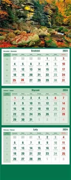 Kalendarz trójdzielny 2024. wymiary: 315x855 mm rodzaj papieru: offset 80g/m2 biały motyw: jesień układ kalendarium: 1 miesiąc - 1 kartka ilość stron: 12 druk: pełnokolorowy Główka pełnokolorowa, okienko przesuwane, nazwy miesięcy i tygodni w wersjach językowych.