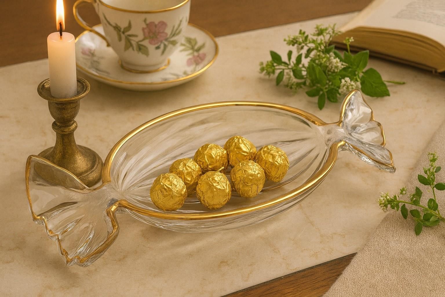 Elegancka patera dekoracyjna wykonana z przezroczystego szkła to propozycja, która łączy oryginalny design i funkcjonalność. Jej wyjątkowy kształt inspirowany zawiniętym cukierkiem sprawia, że przyciąga wzrok i staje się efektownym akcentem na stole. Całość zdobi subtelne, złote wykończenie krawędzi, które dodaje szyku i podkreśla luksusowy charakter naczynia. Patera świetnie sprawdzi się zarówno jako naczynie na drobne słodkości, bakalie czy ciasteczka, jak i samodzielna dekoracja wnętrza. Idealna do nowoczesnych aranżacji, ale także jako oryginalny dodatek do klasycznych wnętrz – wprowadzi odrobinę elegancji i blasku podczas spotkań rodzinnych, świąt czy przyjęć. Specyfikacja: Materiał: szkło Kolor: przezroczysty ze złotym rantem Kształt: cukierek Przeznaczenie: patera na słodycze, owoce, przekąski lub dekorację Zdjęcia aranżacyjne mają charakter poglądowy. Prezentowana aranżacja może zawierać elementy dekoracyjne niewchodzące w skład zestawu. Szczegóły dotyczące zawartości znajdują się w opisie produktu.