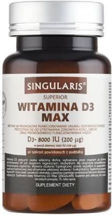 Singularis Superior Witamina D3 Max to suplement diety w tabletkach, którego składniki wspierają prawidłowe wchłanianie wapnia i fosforu, pomagają utrzymać prawidłowy poziom wapnia we krwi oraz wspomagają zdrowie mięśni, kości i układu odpornościowego. Produkt przeznaczony dla osób dorosłych.