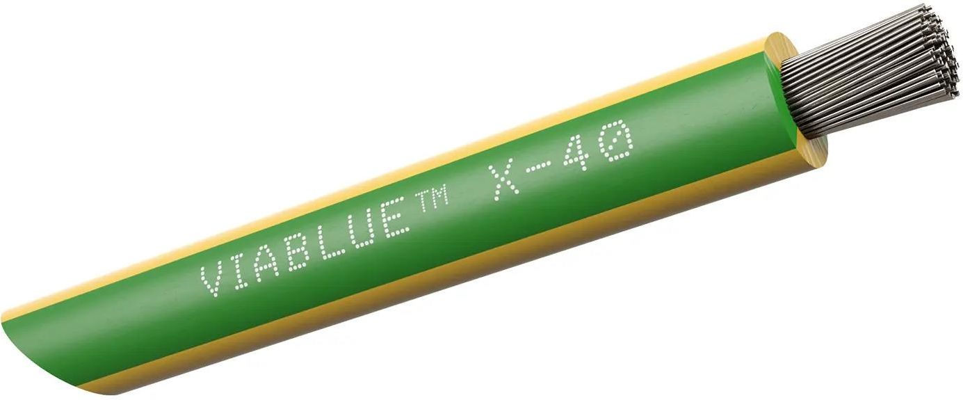 VIABLUE X-40 Silver Single Conductors (G / Green Yellow) Pojedyncze przewodniki kabli zasilających VIABLUE X-Silver idealnie nadają się do wewnętrznego okablowania głośników lub urządzeń elektronicznych. VIABLUE X-Series – dla maksymalnej wydajności Pojedynczy przewód G (Green Yellow) - z cynowanymi żyłami z miedzi beztlenowej (OFC) Miedź OFC OFC oznacza miedź beztlenową – elektrolicznie oczyszczoną miedź o wysokiej przewodności i maksymalnej zawartości tlenu na poziomie 0.001%. Kable VIABLUE™ są produkowane i montowane ręcznie w Niemczech. Gwarantuje to wysoką jakość i odsłuch na najwyższym poziomie. Specyfikacja techniczna: Przekrój przewodnika X-40: 4,0 mm² Średnica zewnętrzna przewodnika X-40: 4,0 mm Liczba drucików (żył) w przewodniku X-40: 224 Rezystancja izolacji: > 20 MΩ × km Napięcie testowe: 3000 V