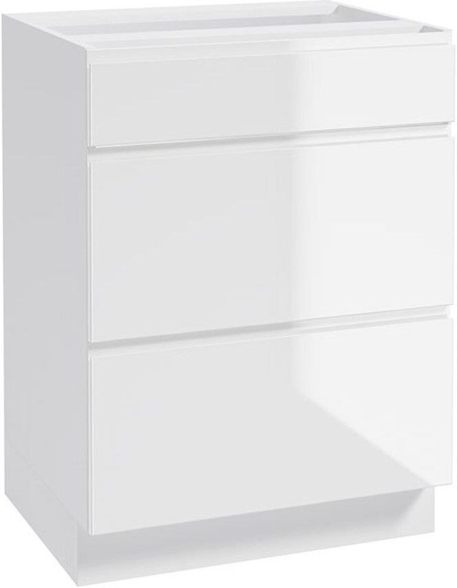 Szafka dolna z serii mebli Parma w kolorze białym o szerokości 60 cm, marki Fig. Czysta forma, minimalistyczny styl i ponadczasowa elegancja - to najważniejsze cechy mebli kuchennych z kolekcji Parma. Szafka przeznaczona jest do zabudowy kuchni pod blat w komplecie z pozostałymi meblami z kolekcji Parma. Szafka wyposażona jest w trzy szerokie i głębokie szuflady o różnej wysokości. Posiada regulowane nóżki, dzięki którym stoi stabilnie, nawet na nierównej podłodze. Wypinany cokół dolny pozwala ukryć nóżki i dopasować mebel do reszty kuchennej zabudowy. Minimalistyczny, nowoczesny design Meble Parma świetnie sprawdzą się w nowoczesnych kuchniach, np. tych urządzonych w stylu skandynawskim, glamour i loftowym. Modny, minimalistyczny design i uniwersalna, biała kolorystyka sprawiają, że dobrze wpiszą się w każdą aranżację. Elegancji dodaje wykończenie na wysoki połysk. Będą dobrym wyborem zarówno do małych kuchni, jak i większych, czy tych z aneksem kuchennym. Fronty z płyty MDF, korpusy z płyty laminowanej Fronty szafek wykonano z trwałej i wytrzymałej płyty MDF o grubości 18 mm, którą dodatkowo pokryto światłoutwardzalnym lakierem, zwiększającym odporność na zarysowania, wilgoć oraz wysoką temperaturę. Korpusy zaś wykonano z płyty laminowanej w o grubości 16 mm. Meble posiadają gładkie fronty, które łatwo utrzymać w czystości. Szuflady z systemem cichego domykania Meble wyposażono w uchwyty FREZ oraz mechanizmy z cichym domykiem (soft close), gwarantującym wysoki komfort użytkowania. Zastosowano prowadnicę z pełnym wysuwem, dzięki której szuflada wysuwa się na pełną głębokość, umożliwiając łatwy dostęp do całości wnętrza. Szufladę wzmocniono konstrukcją w postaci metalowych boków. Dzięki temu możesz w niej przechowywać przedmioty ważące do 40 kg. Różna wysokość szuflad pozwala w pełni wykorzystać dostępną przestrzeń. Górna szuflada jest stosunkowo niska, przez co świetnie nadaje się do przechowywania sztućców. Środkowa i dolna są wyższe, dzięki czemu możesz w nich umieścić większe przedmioty. Stwórz swój zestaw mebli Szafka dostępna jest bez blatu, należy go dokupić osobno. Meble przeznaczone są do samodzielnego montażu. Możesz dobrać pasujące elementy i skomponować dowolną, dopasowaną do swoich potrzeb zabudowę. Stwórz kuchnię skrojoną na miarę, sprawdź pozostałe elementy z serii Parma. kuchenne">.
