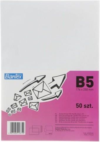 BANTEX Koperty B5 Biurowe Białe do Pakowania 50szt Producent: BANTEX B218754Wysoka jakość papieruKolor białySamoklejące (SK) lub z samoklejące z paskiem (HK)Opakowanie 25 szt. Cena za 1 sztukę, wzór i kolor wysyłany losowo
