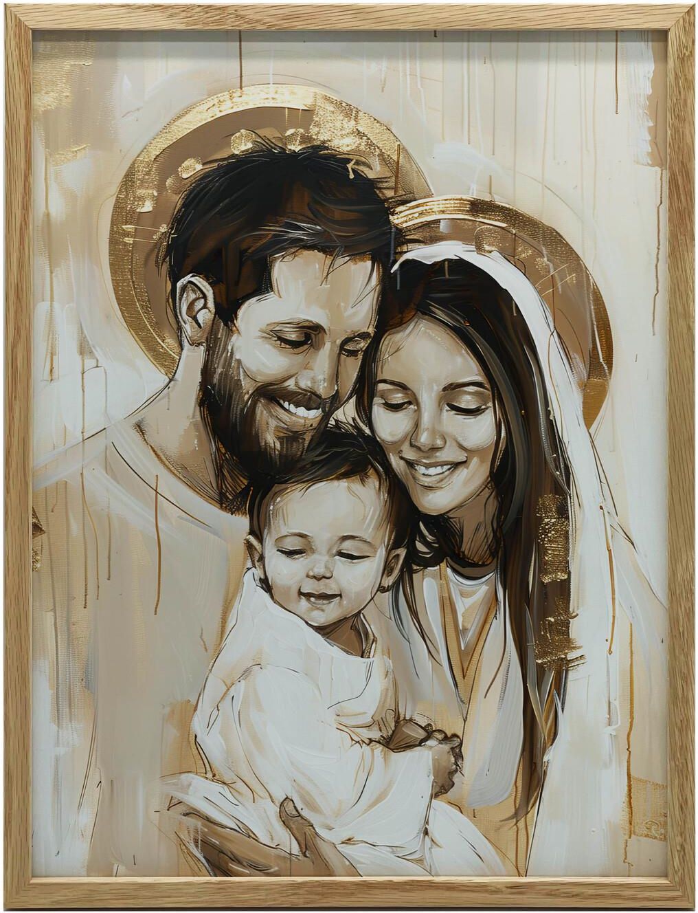 Plakat zatytułowany "Rodzina Boża - Uśmiech Jezusa" ukazuje piękną scenę rodzinną, w której Maryja i Józef trzymają uśmiechającego się Jezusa. Całość utrzymana jest w złotych i neutralnych barwach, co wprowadza ciepło oraz harmonię do wnętrza. Białe tło i delikatne odcienie beżu tworzą radosną atmosferę, idealną do dekoracji domowych przestrzeni. Styl malowidła olejnego z efektami airbrush nadaje obrazowi niepowtarzalny charakter, podkreślając piękno tej chwili.Plakat świetnie nadaje się jako dekoracja w sypialni, salonie czy pokoju dziecięcym, wprowadzając element duchowości i wartości rodzinnych. Może być także doskonałym prezentem na specjalne okazje, takie jak chrzest czy ślub.