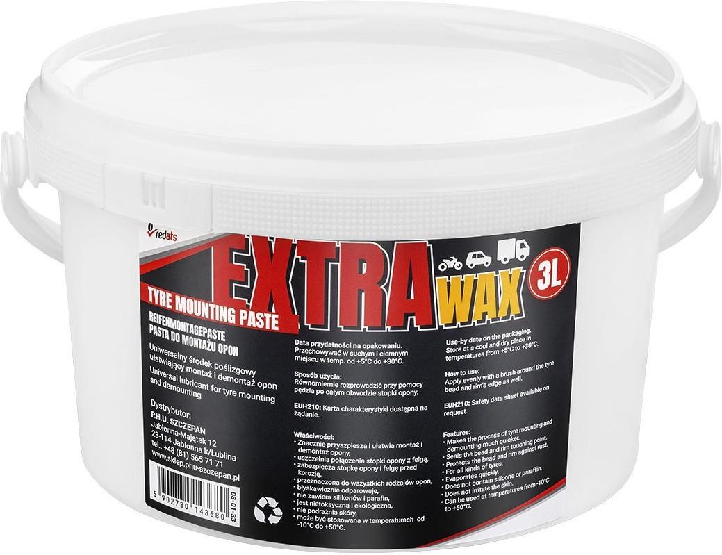 Co powinieneś wiedzieć o tej paście? łatwo się rozprowadza i szybko odparowuje ułatwi Ci montaż i demontaż opon z felg może być stosowana do każdego typu opon uszczelnia miejsce styku opona-felga jest na bazie wody, więc jest bezpieczna dla gumy Zajmuje minimum przestrzeni Pastę zapakowaliśmy w 3-litrowe wiaderko. Bez problemu zmieści się na przykład na półce lub w innym miejscu Twojego serwisu, nie zajmując przy tym przesadnie sporo miejsca. Pasta montażowa na bazie wody - zalety Ten produkt chroni oponę przed zapieczeniem się na feldze. To pasta na bazie wody, więc, w odróżnieniu od produktów opartych na ropie, jest w pełni bezpieczna dla stopki opony. Szybka i prosta aplikacja Wewnątrz tego opakowania jest jednolita i zwarta maść. To oznacza, że bez problemu nałożysz nawet cienką warstwę, bez zbędnych zwałów i grudek. Pasta montażowa do opon Extra Wax perfekcyjnie przylega do wnętrza opony i świetnie się rozprowadza. Po nałożeniu, bardzo szybko się wchłania i równie szybko odparowuje, więc nie ma tu obawy o samoczynne przesuwanie opony względem felgi. Jak aplikować tę pastę? To proste. Równomiernie rozprowadź tę maść do opon po całym obwodzie stopki i rancie felgi. Możesz użyć do tego gąbki albo pędzla.