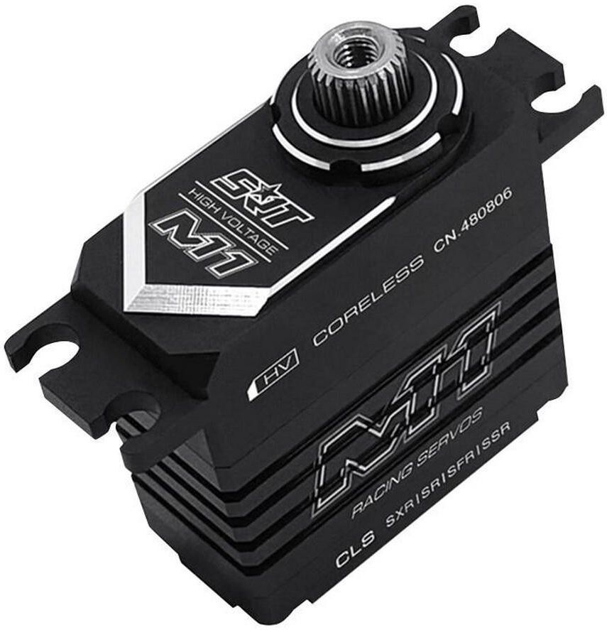 Servo bezrdzeniowe M11 HiVOLT (9kg-0,055s/60°) Servo bezrdzeniowe M11 HiVOLT w skali 1/12 doskonale sprawdzi się w różnych modelach pojazdów RC. Obsługuje kilka trybów pracy (również tych o wysokiej prędkości), w tym SXR, SFR, SR i SSR. Dzięki temu nadaje się do wielu zastosowań. Wyróżnia się także imponującą wydajnością i niskim zużyciem energii. Co więcej, cechuje się niewielką martwą strefą, która wynosi tylko około 2 μs. To oznacza, że błyskawicznie reaguje na zmiany sygnałów sterujących, zapewniając precyzyjną kontrolę ruchu. Model SRT-M11 Typ Cyfrowe Łożyska Podwójne Rodzaj silnika Bezrdzeniowy Rodzaj przekładni Metalowa Materiał przekładni Tytan i stal System sterowania Sterowanie szerokością impulsu Częstotliwość robocza 1520 μs / 330 Hz Napięcie robocze DC 6,0-8,4 V Prędkość robocza (6,0 V) 0,07 s/60 stopni bez obciążenia Prędkość robocza (7,4 V) 0,065 s/60 stopni bez obciążenia Prędkość robocza (8,4 V) 0,055 s/60 stopni bez obciążenia Maks. moment obrotowy (6,0 V) 7,0 kg.cm Maks. moment obrotowy (7,4 V) 8,0 kg.cm Maks. moment obrotowy (8,4 V) 9,0 kg.cm Napęd potencjometru Bezpośredni Wymiary 28,5 x 13,4 x 29 mm Waga 28 g Długość przewodu złącza 170 mm (złącze typu JR)