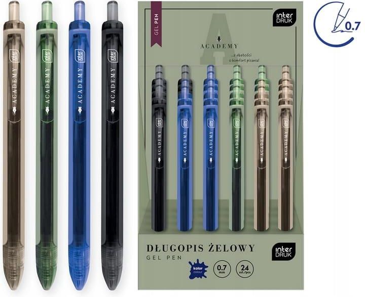 Długopis żelowy Academy automatyczny – wygoda i styl w pisaniu Długopis żelowy z serii Academy to niezawodne akcesorium do codziennego pisania. Wyposażony w mechanizm automatyczny (klikający), umożliwia szybkie i wygodne wysuwanie wkładu, co czyni go praktycznym zarówno w szkole, jak i w pracy. Niebieski tusz zapewnia czytelny zapis, a standardowa, szpiczasta końcówka pozwala na płynne i precyzyjne prowadzenie linii. Ergonomiczny uchwyt gwarantuje komfort nawet podczas długiego pisania, minimalizując zmęczenie dłoni. Cechy produktu: Typ: długopis żelowy automatyczny (klikający). Kolor wkładu: niebieski – uniwersalny i czytelny. Końcówka: standardowa, szpiczasta. Obudowa: plastikowa, w różnych kolorach (wysyłane losowo). Ergonomiczny uchwyt – wygodne i komfortowe pisanie. Nietoksyczny tusz – bezpieczny dla dzieci. Długopis żelowy Academy to idealny wybór do szkoły, biura i domu – łączy funkcjonalność, nowoczesny wygląd i wygodę użytkowania.