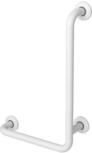 Uchwyt kątowy dla niepełnosprawnych prawy biały Materiał: stal węglowa Wykończenie: farba epoksydowa biała Grubość pokrycia epoksydowego: 70µ Pozycja: lewa Długość poręczy: ramię pionowe 800mm, ramię poziome 400mm Wymiary całkowite: 859x459x75mm Odległość od ściany: 43mm Średnica rury: O32 Średnica wspornika: O75 Grubość stali: rura 1,5 mm, wspornik 3 mm Kąt gięcia rury: 90° Rodzaj łączenia elementów stalowych: spawanie TIG Możliwość montażu pionowego i poziomego Maksymalne obciążenie: 120 kg Ilość punktów podparcia: 3 Mocowanie do ściany na 9 śrub ze stali nierdzewnej o wymiarach 5x60 mm Kołki rozporowe nylonowe: 9 sztuk o wymiarach: 8x50 mm Waga netto: 1,6 kg Waga z opakowaniem: 2,0 kg zastosowanie: WC prysznic Produkt uzyskał certyfikat TÜV Rheinland.