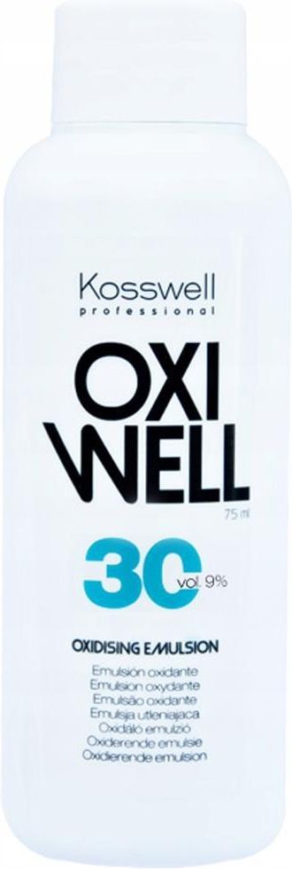 Kosswell Oxiwell 9% - woda utleniona w osnowie kremowej do wykonywania zabiegów fryzjerskich na włosach. Posiada stabilizatory utleniaczy najwyższej jakości stosowanych do koloryzacji i rozjaśniania włosów. Dzięki temu sprawia że zabiegi chemiczne są bezpieczniejsze i łagodniejsze dla struktury włosów. Woda utleniona występuje w kilku stężeniach: 10vol. - 3%, 20vol. - 6%, 30vol. - 9%, 40vol. -12%.