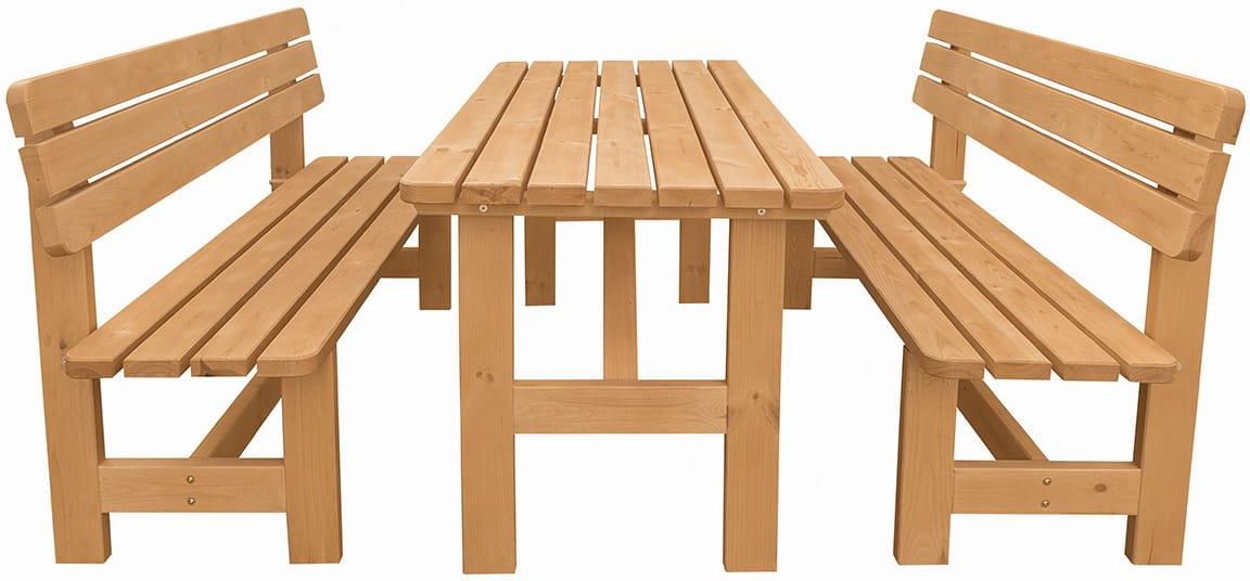 Meble ogrodowe z wysokiej jakości litego drewna sosnowego odpornego na warunki atmosferyczne. Stabilna i masywna konstrukcja kompletu ogrodowego gwarantuje bezpieczne i pewne użytkowanie. Komfortowe ławki wraz ze stołem będą świetnym miejscem wypoczynku a ich klasyczny i estetyczny wygląd …