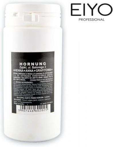 HORNUNG HENNA ANNA W PROSZKU Profesjonalna henna w proszku do barwienia brwi i rzęs „Anna” Bardzo wydajny proszek o intensywnym kolorze. Służy do barwienia brwi i rzęs. Nadaje się również do wykonywania tatuaży. Bardzo dokładne krycie przy odpowiedniej proporcji mieszaniny z wodą utlenioną. Posiada atest MZiOS-KS249. Posiada certyfikat wystawiony przez Narodowy Instytut Zdrowia Publicznego. Certyfikat ten zaświadcza, że henna ta nie stanowi żadnego zagrożenia dla zdrowia człowieka. Doskonała jakość (jest wszechstronnie przebadana oraz posiada świadectwo jakości zdrowotnej), Wydajna, Rewelacyjne krycie. Jak stosować hennę Anna: Hennę zmieszać z 3% wodą utlenioną aż do uzyskania konsystencji gęstej zawiesiny. Nałożyć na umyte brwi i rzęsy. Po 10 minutach zmyć wodą. Pojemność: 100 g Firma Hornung zajmuje się produkcją henny „Anna” od 1990 roku. Sekretem wysokiej jakości ich produktu jest fakt, iż opierają się na recepturze inżyniera Antoniego Hornung, który był jednym z najlepszych chemików przedwojennej Polski.