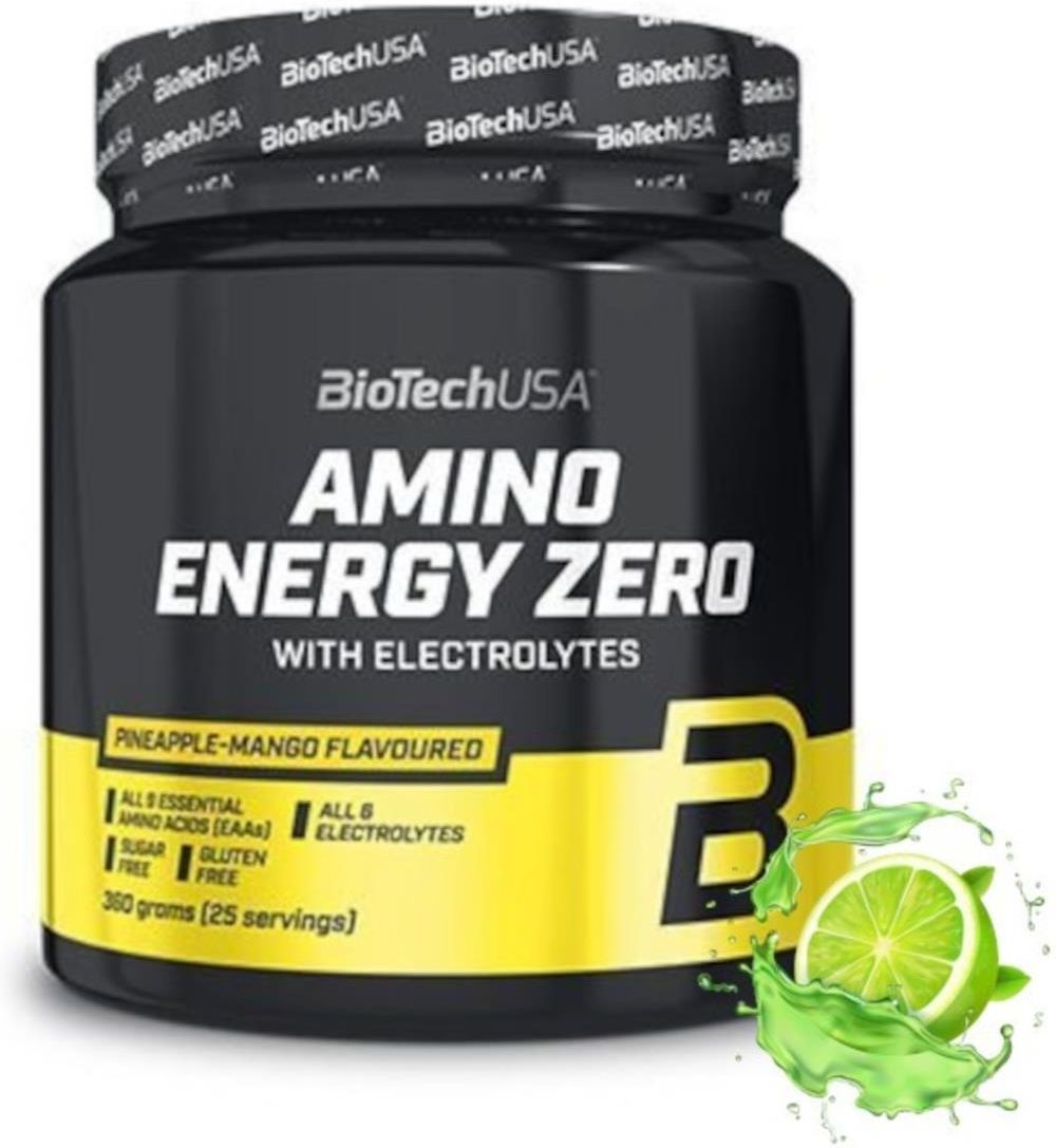 Biotech Usa Amino Energy Zero 360G  Napój w proszku - suplement diety zawierający kofeinę, aminokwasy egzogenne i endogenne, elektrolity, witaminę B6 oraz substancję słodzącą.  W każdej porcji zawiera 7250 mg aminokwasów Zawiera całkowite spektrum niezbędnych (egzogennych) aminokwasów Zawiera również takie składniki charakterystyczne dla formuł przeznaczonych do stosowania przed treningiem, jak beta alanina, L-arginina lub L-tyrozyna Każda porcja zawiera 100 mg kofeiny pochodzącej z 3 różnych źródeł W każdej porcji zawiera 500 mg tauryny Zawiera wszystkie 6 rodzajów elektrolitów Zawiera witaminę B6 Nie zawiera cukru Nie zawiera glutenu
