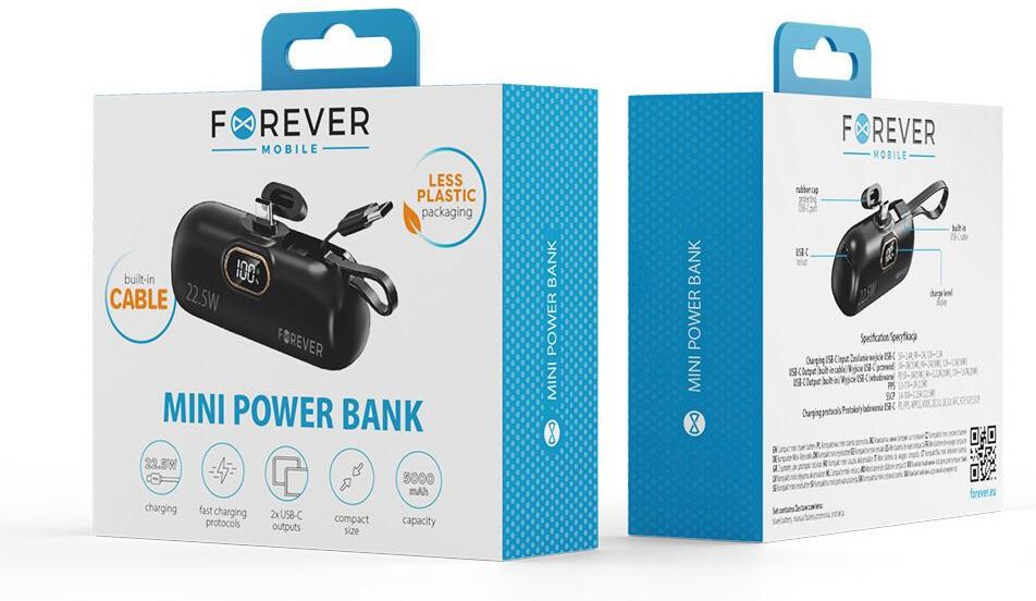 Powerbank mini USB-C 5000 mAh z wyświetlaczem 22.5W bateria zewnętrzna Forever mini power bank MTB-100 22.5W 5000 mAh USB C czarny Kieszonkowy mini power bank do Iphone marki Forever to kompaktowe urządzenie, które zapewni szybkie ładowanie Twoich urządzeń gdziekolwiek się znajdziesz. Zawsze pod …