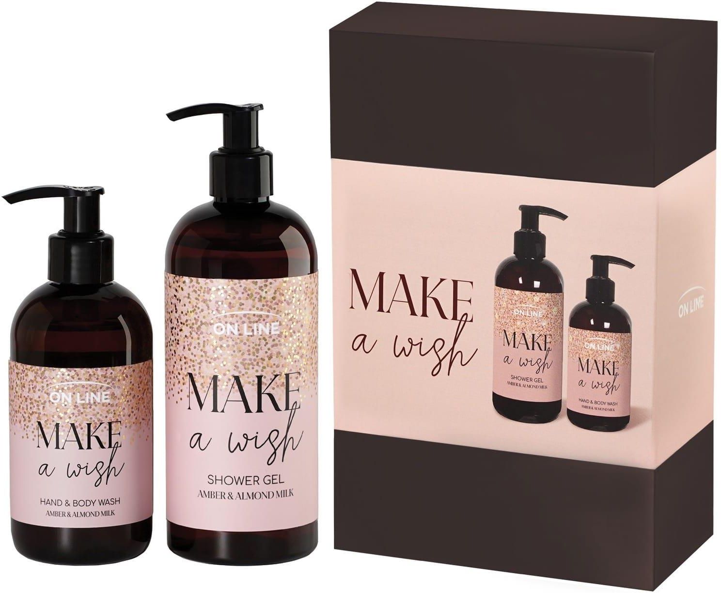 Make a wish odświeżające mydło do rąk i ciała zawierające ekstrakt z bursztynu i mleczko migdałowe/On Line Make a wish odświeżający żel pod prysznic zawierający ekstrakt z bursztynu i mleczko migdałowe. Ostrzeżenia: Unikać kontaktu z oczami. W przypadku kontaktu z oczami przemyć dużą ilością wody. Przechowywać w miejscu niedostępnym dla dzieci. Wyłącznie do użytku zewnętrznego. Sposób użycia: niewielką ilość produktu nanieść na zwilżoną skórę, myć powstałą pianą, dokładnie spłukać. Skład: soap: Aqua, Sodium Laureth Sulfate, Cocamidopropyl Betaine, Sodium Chloride, Amber Extract, Prunus Amygdalus Dulcis Seed Extract, Parfum, Citric Acid, Propylene Glycol, Macadamia Ternifolia Seed Oil, Tocopherol, Hydrogenated Lecithin, Triheptanoin, Trilaurin, Hydrogenated Olive Oil Caprylyl Esters, Sodium Benzoate, Potassium Sorbate, Benzyl Alcohol, Dehydroacetic Acid, Tetrasodium Glutamate Diacetate, Xanthan Gum, Sodium Hydroxide, Hexyl Cinnamal, Linalool, Tetramethyl Acetyloctahydronaphthalenes. gel: Aqua, Sodium Laureth Sulfate, Cocamidopropyl Betaine, Sodium Chloride, Amber Extract, Prunus Amygdalus Dulcis Seed Extract, Parfum, Citric Acid, Propylene Glycol, Macadamia Ternifolia Seed Oil, Tocopherol, Hydrogenated Lecithin, Triheptanoin, Trilaurin, Hydrogenated Olive Oil Caprylyl Esters, Sodium Benzoate, Potassium Sorbate, Benzyl Alcohol, Dehydroacetic Acid, Tetrasodium Glutamate Diacetate, Xanthan Gum, Sodium Hydroxide, Hexyl Cinnamal, Linalool, Tetramethyl Acetyloctahydronaphthalenes.
