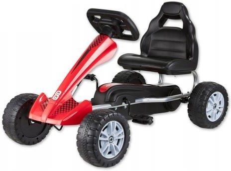Gokart na pedały dla dzieci sportowy duży jeździk dziecięcy bezpieczny 30kgGokart pedałowy – niezapomniana frajda i aktywność na świeżym powietrzu!Specyfikacja techniczna pojazduPrzeznaczenie: dzieci od 3 latMaksymalna waga użytkownika: do 30 kgMateriał ramy: stalKoła: 4 duże koła z trwałego materiału, bieżnikowaneSiedzenie: regulowane przy montażu, ergonomiczne, z tworzywa odpornego na warunki atmosferyczneKierownica: skrętna, z wygodnym uchwytemNapęd: łańcuchowy, osłoniętyWymiar gokarta:Długość – 82 cmSzerokość (rozstaw kół) – 45 cmWysokość do kierownicy – 48 cmWysokość do oparcia – 51 cmwymiar kierownicy – 15x21 cmSzerokość siedziska – 27 cmGłębokość siedziska – 18 cmWysokość oparcia – 23 cmŚrednica koła przód – 20 cm ; koła tył – 22 cm ; szerokość opony – 7,5Odległość od siedziska do pedałów ustawionych w pionie – 19 cmWaga – 5,8 kgWymiar opakowania: 80x25x51Waga z opakowaniem: 7,3 kgWytrzymała i bezpieczna konstrukcjaWykonany z wysokiej jakości materiałów, zapewnia stabilność i niezawodność, a rodzicom spokój o bezpieczeństwo dziecka.Stalowa rama – mocna, odporna na uszkodzenia i wstrząsyDuże koła z trwałego materiału – zapewniają cichą i płynną jazdę po różnych nawierzchniachOsłonięty łańcuch – całkowita ochrona mechanizmu dla bezpieczeństwa dzieckaRegulowane siedzisko – dwa warianty dopasowaniaSkrętna kierownica – łatwe manewrowanie i kontrola nad jazdąKierownica – wygodne prowadzenie i pełna kontrolaKierownica naszego gokarta została zaprojektowana tak, aby zapewniała małym dłoniom pewny chwyt.Jej ergonomiczna forma i łatwość skręcania umożliwiają dziecku sprawne manewrowanie, ucząc koordynacji i refleksu.Siedzisko – komfort dopasowany do dzieckaRegulowane siedzisko pozwala dopasować pozycję do wzrostu dziecka poprzez montowanie w dwóch możliwych ustawieniach.Rama – trwałość i stabilność konstrukcjiStalowa rama zapewnia stabilność i odporność na wstrząsy. Gokart na pedały dla dzieci jest jednocześnie solidny i stosunkowo lekki, co ułatwia przenoszenie.Koła – dobra przyczepność i komfort jazdyDuże koła z bieżnikiem gwarantują stabilność i przyczepność na różnych nawierzchniach – od asfaltu po trawnik.Bezpieczeństwo przede wszystkim!Nasz gokart został zaprojektowany z myślą o bezpieczeństwie najmłodszych.Spełnia normy CE i EN71, co daje rodzicom pewność jakości i ochrony dziecka.