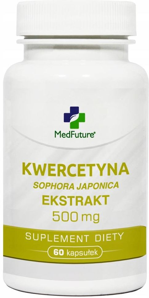 Kwercetyna ekstrakt - 500 mg Właściwości kwercetyny Główne działanie Przeciwzapalne – hamuje cytokiny zapalne, pomocna przy astmie, zapaleniu stawów, chorobach serca. Przeciwutleniające – neutralizuje wolne rodniki, chroni komórki, wspiera skórę, serce i mózg. Wzmacnia odporność – działa immunomodulująco, łagodzi alergie i zwiększa odporność na infekcje. Po jakim czasie widać wyniki działania kwercetyny? Czas działania: Efekty stosowania kwercetyny mogą być zauważalne po około 1-2 tygodniach regularnego stosowania, zwłaszcza w przypadku poprawy odporności, zmniejszenia objawów zapalenia lub zmniejszenia reakcji alergicznych. Długotrwałe efekty: W przypadku pełnych korzyści zdrowotnych, takich jak wsparcie układu sercowo-naczyniowego czy zmniejszenie przewlekłego stanu zapalnego, może minąć od kilku tygodni do kilku miesięcy, w zależności od indywidualnych warunków i stanu zdrowia. Kwercetyna jest skuteczna, gdy jest stosowana regularnie, a jej wyniki stają się bardziej widoczne w dłuższym okresie suplementacji. Z czym łączyć kwercetynę? Witamina C – wzmacnia działanie przeciwutleniające, poprawia wchłanianie. Piperyna (z pieprzu) – zwiększa biodostępność kwercetyny. Kurkumina – wspiera działanie przeciwzapalne, pomaga w detoksykacji. Witamina D – wspólne działanie dla silniejszej odporności i redukcji stanów zapalnych. Suplement diety – Kwercetyna ekstrakt 500 mg Składniki: Ekstrakt z kwiatów perełkowca japońskiego (Sophora Japonica L), otoczka kapsułki (celuloza mikrokrystaliczna) Zalecane spożycie: Spożywać 1-2 kapsułki dziennie. Składniki aktywne Zawartość w Zawartość w % RWS* Ekstrakt z kwiatów 1 kapsułce 2 kapsułkach perełkowca japońskiego 500 mg 1000 mg - (Sophora Japonica L) - w tym: 95% kwercetyna 475 mg 950 mg - * RWS - Referencyjna Wartość Spożycia Przechowywanie: Przechowywać w temperaturze pokojowej, w chłodnym i suchym miejscu, niedostępnym dla małych dzieci. Zawartość opakowania: 60 kapsułek Ostrzeżenia: Nie przekraczać zalecanej porcji do spożycia w ciągu dnia. Suplement diety nie może być stosowany jako zamiennik zróżnicowanej diety. Utrzymanie prawidłowego stanu zdrowia wymaga zróżnicowanego odżywiania i prowadzenia zdrowego trybu życia. Stosowanie produktu jest przeciwwskazane w przypadku nadwrażliwości, uczulenia na składniki produktu. Suplement diety nie powinien być spożywany przez dzieci. Kobiety w ciąży i karmiące przed zastosowaniem suplementu diety, powinny zgłosić się do lekarza. Najlepiej spożyć przed końcem: Data minimalnej trwałości i numer partii produkcyjnej znajdują się na spodzie opakowania Producent Medfuture Sp. z o.o. Pl. Powstańców Śląskich 16-18 53-314 Wrocław
