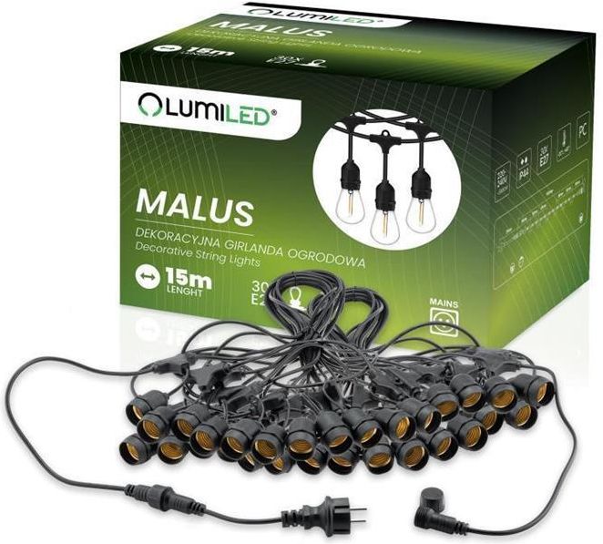 Girlanda Ogrodowa Zewnętrzna MALUS Łańcuch Świetlny 15m 30x E27 LUMILED Główne cechy produktu Stanowi piękny dodatek do dekoracji zewnętrznych jak i wewnętrznych Łańcuch świetlny o długości 15m 30 punktów świetlnych w odległości co 50cm Odległość od zasilania do pierwszej żarówki wynosi 45cm …