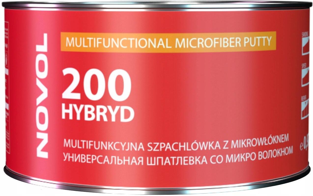 Szpachla NOVOL 200 HYBRYD z mikrowłókien 1L Nowoczesna multifunkcyjna szpachlówka oparta na połączeniu mikrowłókien szklanych oraz syntetycznych wypełniaczach mikrosferycznych, przez co charakteryzuje się unikalnie niskim skurczem objętościowym. Dłuższy czas otwarcia pozwala na doskonałą pracę przy mniejszych i większych naprawach. W szpachlówce zastosowano system Mixing Indicator który powoduje mniejsze wchłanianie wilgoci. Sposób użycia Przed nałożeniem należy oczyścić i przeszlifować powierzchnię wg zaleceń oraz dokładnie wydmuchać pył powstały po szlifowaniu Odtłuścić powierzchnię Następnie należy na 100ml szpachli NOVOL dodać 2ml utwardzacza i dokładnie wymieszać.Czas wiązania preparatów od 4-6minut,temp.20 stopni celsjusza. Gotową masę nakładać szpachelką pod kątem 60 stopni tak aby grubość nakładanej warstwy nie przekroczyła 1-2mm.