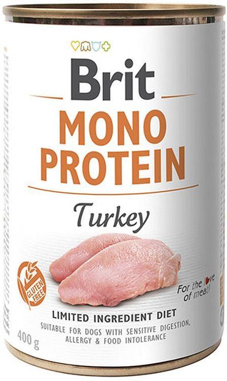 Brit Mono Protein Turkey 400G BRIT MONO PROTEIN TURKEY PEŁNOPORCJOWA KARMA WILGOTNA Z INDYKIEM DLA PSÓW WSZYSTKICH RAS. ODPOWIEDNIA DLA PSÓW Z WRAŻLIWYM PRZEWODEM POKARMOWYM, ALERGIĄ I NIETOLERANCJĄ POKARMOWĄ Bez soi. Bez glutenu. Bez dodatku konserwantów i barwników. 100% czystego białka indyka. Brit Mono Protein Turkey zapewnia kompletne i zbilansowane żywienie z ograniczoną liczbą składników. Dzięki zastosowaniu jednego rodzaju białka jest to odpowiednia karma do zmniejszenia ryzyka alergii i nietolerancji pokarmowej. Puszkę należy podawać w temperaturze pokojowej. Dawkowanie karmy może różnić się w zależności od aktywności psa i środowiska, w którym żyje. Podając puszkę celem urozmaicenia i wzbogacenia smaku posiłków, należy odpowiednio pomniejszyć dzienną porcję karmy podstawowej. Należy zapewnić psu dostęp do świeżej wody. a Energia Metaboliczna 1 260 kcal/kg SKŁAD 74% indyk (mięso, narządy), 3% skrobia grochowa, 1%   błonnik grochowy. SKŁADNIKI ANALITYCZNE białko surowe 9,0%, tłuszcz surowy 10,0%, popiół surowy 2,0%, wilgotność 78,0%,  włókno surowe 0,5%, wapń 0,2%, fosfor 0,3%, sód 0,4%. DODATKI DIETETYCZNE NA 1 KG  witamina D3 (E671) 250 j.m., witamina E (3a700) 100 mg, cynk (3b606) 15 mg,  żelazo (E1) 10 mg, mangan (E5) 3 mg, jod (3b201) 0,75 mg, miedź (E4) 0,5 mg, biotyna (3a880) 0,2 mg.  DODATKI TECHNOLOGICZNE W 1 KG mączka chleba świętojańskiego (E410) 5 000 mg SPRAWDŹ CAŁĄ GAMĘ PRODUKTÓW BRIT MONO PROTEIN Profilaktyka przez żywienie - to główna zasada, którą spełniają starannie skomponowane karmy Brit Care. Wiemy, że zwierzęta domowe są w równym stopniu jak my sami narażone na stres i poważne choroby, dlatego z miłości do nich opracowaliśmy unikalną recepturę, opartą na wyselekcjonowanych składnikach. Wierzymy, że odpowiednia dieta ma ogromne znaczenie dla zdrowia i kondycji naszych czworonożnych przyjaciół. Stąd w karmach Brit znajdziecie tylko to, co najlepsze: wysokiej jakości mięso, ryby, warzywa i owoce, zioła oraz składniki funkcjonalne.