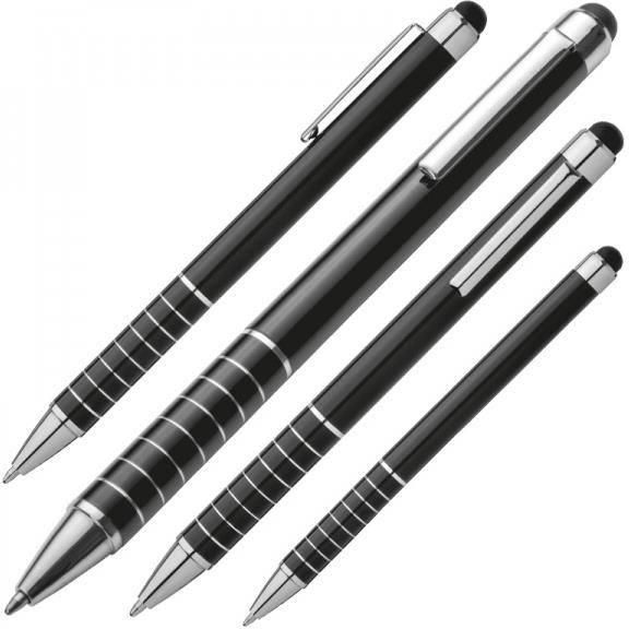 Długopis metalowy z mechanizmem obrotowym i gumką do obsługi ekranów dotykowych. Posiada wkład piszący na niebiesko. Logotyp można umieścić pod klipem.
