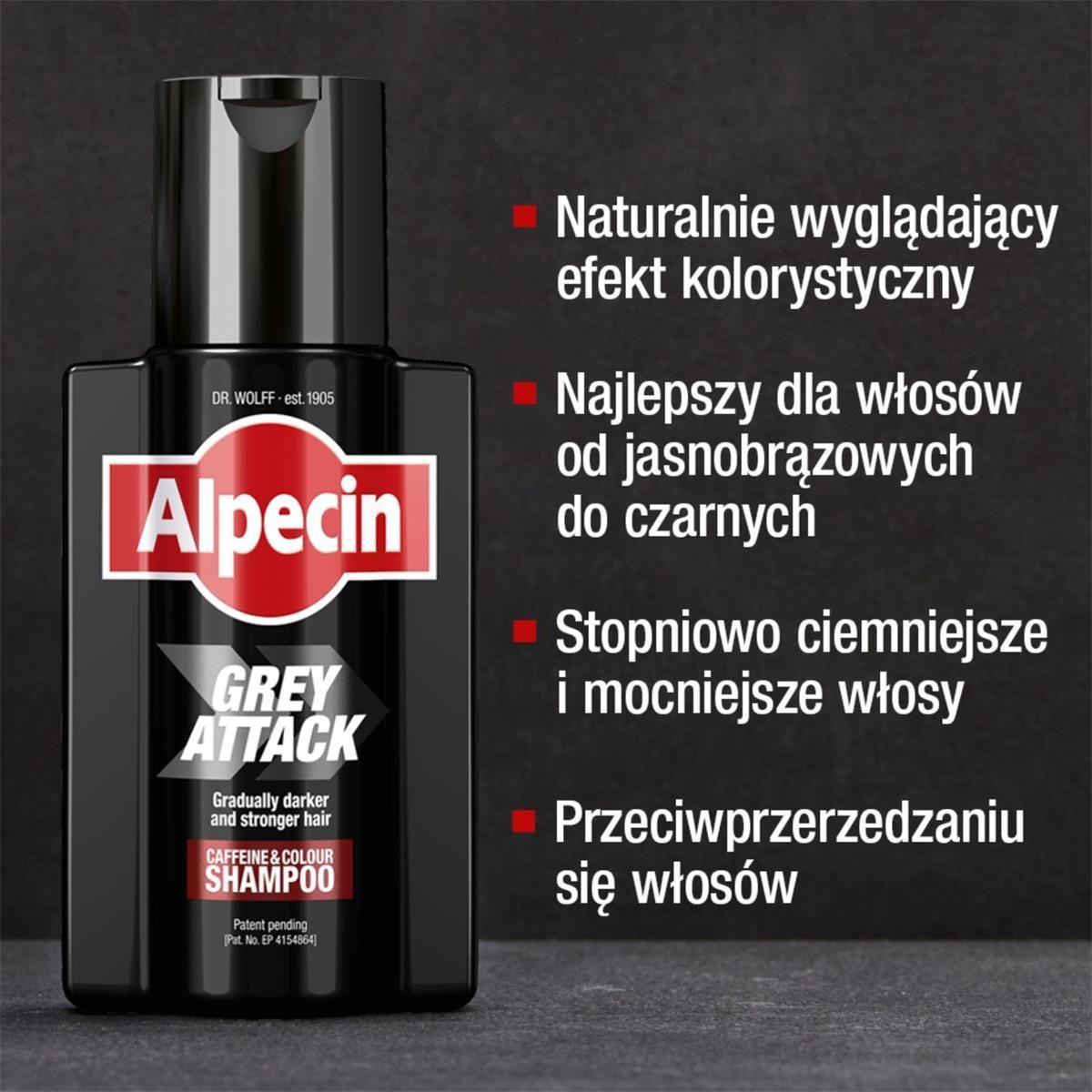 Alpecin Grey Attack po prostu przyciemnia włosy krok po kroku – zapewniając wyjątkowo naturalny efekt kolorystyczny. Nadaje się do każdego koloru włosów. Najlepszy do włosów od jasnobrązowego do czarnego. Fakt: 7 na 10 mężczyzn uważa, że siwe włosy ich postarzają* Dla wszystkich mężczyzn, którzy chcieliby coś zrobić ze swoimi (pierwszymi) siwymi włosami, Alpecin Grey Attack jako nowy szampon Caffeine & Color oferuje to, co najlepsze dla siwych włosów u mężczyzn: możliwość ponownego przyciemnienia włosów krok po kroku w ciągu zaledwie dwóch do pięciu minut pod prysznicem - zapewniając wyjątkowo naturalny efekt kolorystyczny! Szampon zapobiegający siwieniu z technologią repigmentacji Innowacyjna technologia repigmentacji opiera się na zgłoszonej do opatentowania formule: aktywny składnik 5,6-DHI gromadzi się we włosach podczas mycia szamponem i reaguje z tlenem zawartym w powietrzu, tworząc pigment koloru. W rezultacie odcień włosów stopniowo staje się ciemniejszy. Trwały kolor włosów, który odrasta wraz z włosami. Ponadto dobrze znany kompleks kofeinowy zapobiega przedwczesnemu wypadaniu włosów, dostarczając cebulkom włosowym energii do wzrostu. *Źródło: Ankieta Appinio z udziałem n=600 niemieckich mężczyzn, 2017 r.