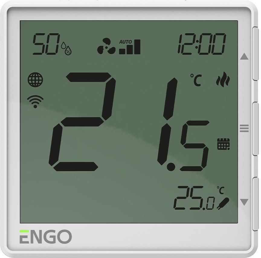 Regulator klimakonwektorów, 230V, internetowy, podtynkowy, WiFi, biały Bezprzewodowa komunikacja przez Wi-Fi 2,4GHz i MODBUS RS-485 dla integracji z systemami. Sterowanie klimakonwektorami 2 lub 4-rurowymi zapewnia elastyczne zarządzanie ogrzewaniem i chłodzeniem. Obsługa wentylatorów 3-biegowych 230V z automatyczną i ręczną regulacją. Sterowanie układem mieszanym: chłodzenie klimakonwektorem i ogrzewanie podłogowe. Funkcja ochrony przed zamarzaniem i przegrzaniem zapewnia bezpieczeństwo. Zdalne sterowanie przez aplikację ENGO Smart. Pomiar wilgotności i temperatury do monitorowania warunków w pomieszczeniu. Pamięć ustawień po utracie zasilania. Tryb ekonomiczny (ECO) zmniejsza zużycie energii. Obciążenie wyjść do 5(2)A dla klimakonwektorów i grzejników kanałowych. Łatwa instalacja i konfiguracja. Dane techniczne Zasilanie: 230V AC Zakres nastawy temperatury: 5 – 45°C Dokładność wyświetlania temp.: 0,1 lub 0,5°C Algorytm sterowania: Delta FAN, Histereza (od ±0.1°C do ±2°C) Komunikacja: Wi-Fi 2,4GHz MODBUS RS-485 Wejście: S1/COM – czujnik temperatury lub styk beznapięciowy S2/COM – czujnik temperatury lub styk beznapięciowy Wyjście sterowania zaworem: V1, V2 – 230V AC, 5(2)A Wyjście sterowania wentylatorem: F1, F2, F3 – 230V AC, 5(2)A Wymiary [mm]: 90 x 90 x 44
