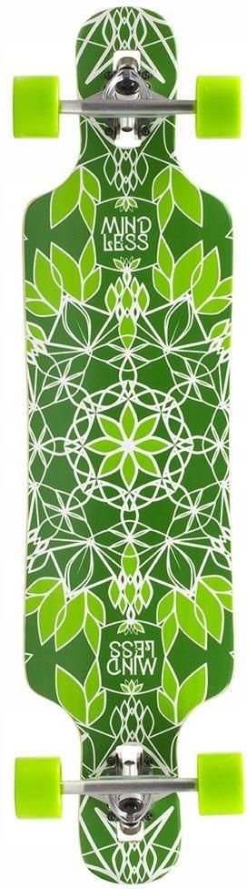 Kompletny Longboard Mindless sanke 3 green Realizacja zamówienia w ciągu 7 dni roboczych. Wyjądkowa konstrukcja, duża szerokość i elastyczność decka czyni Longboard Mindless sanke 3 dedykowanym do trików i tańca. Profil deski symetryczny dual kicked Wymiary i rozstaw osi Długość: 39 cala , Szerokość: 9,5 cala, Konstrukcja Deck Klon 8 warstw Trucki 7 calowe Tuleje Twardośc 85a Koła Shifta 76 x 53 Twardość 78a Łożyska ABEC-5 Chrome Bearings Waga użytkownika max. 90kg