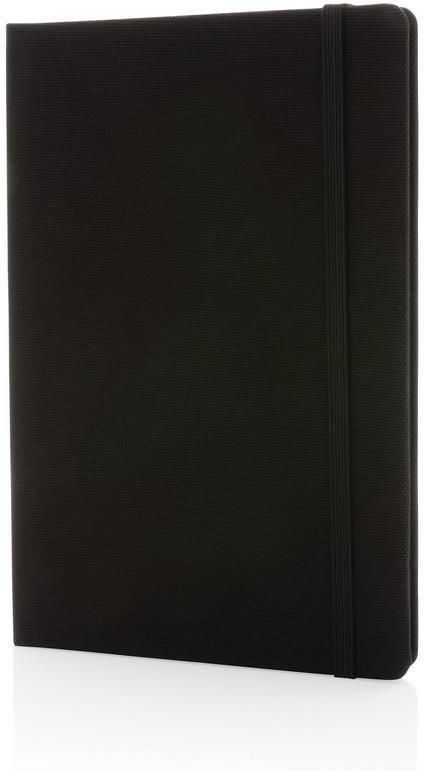 Notatnik A5, RPET P774.451 Czarny Stan: Nowy Materiał: rPET Wymiary (cm): 21,3 x 14,2 x 1,5 Kolory: Czarny Notatnik (80 kartek 70g/m2 w linie), wykonany z materiałów pochodzących z recyklingu z certyfikatem GRS, całkowita zawartość materiałów z recyklingu obliczona na podstawie wagi całkowitej produktu: 68%