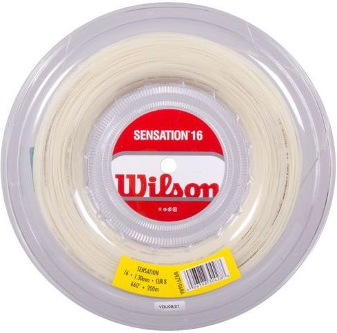 Wysokiej jakości naciąg syntetyczny tenisowy Sensation firmy Wilson - zapewniający graczom bardzo duzy komfort, dobre czucie i grywalność. Komfortowe struny będące połączeniem dynamiki, kontroli i komfortu gry. Dzięki zastosowaniu wielu mikrowłókien otoczonych dwoma nylonowymi powłokami naciąg daje bardzo dobre przypsieszenie i jest dość wytrzymały. Charakteryzuje się niską utratą naprężeń. Wilson Sensation wykazuje zwiększoną wytrzymałości na niecentryczne trafienia - uderzenia przy ramie. Jego właściwości istotnie pomagają tłumić drgania podczas gry dlatego jest polecany dla graczy cierpiących na tzw. 'łokieć tenisisty'. Grubość: 1,25; 1,30; 1,35 mm Długość: 200 m. Kolor: naturalny.