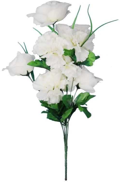 Sztuczny bukiet z róż i goździków to elegancka kompozycja, która zachwyca realistycznym wyglądem. Perfekcyjnie imituje naturalne kwiaty, dodając wnętrzom, tarasom czy miejscom pamięci wyjątkowego uroku i klasy. Doskonale sprawdzi się zarówno jako samodzielna dekoracja, jak i w większych aranżacjach, podkreślając ich estetykę i harmonię. Bukiet o wysokości 52 cm i średnicy 10 cm.