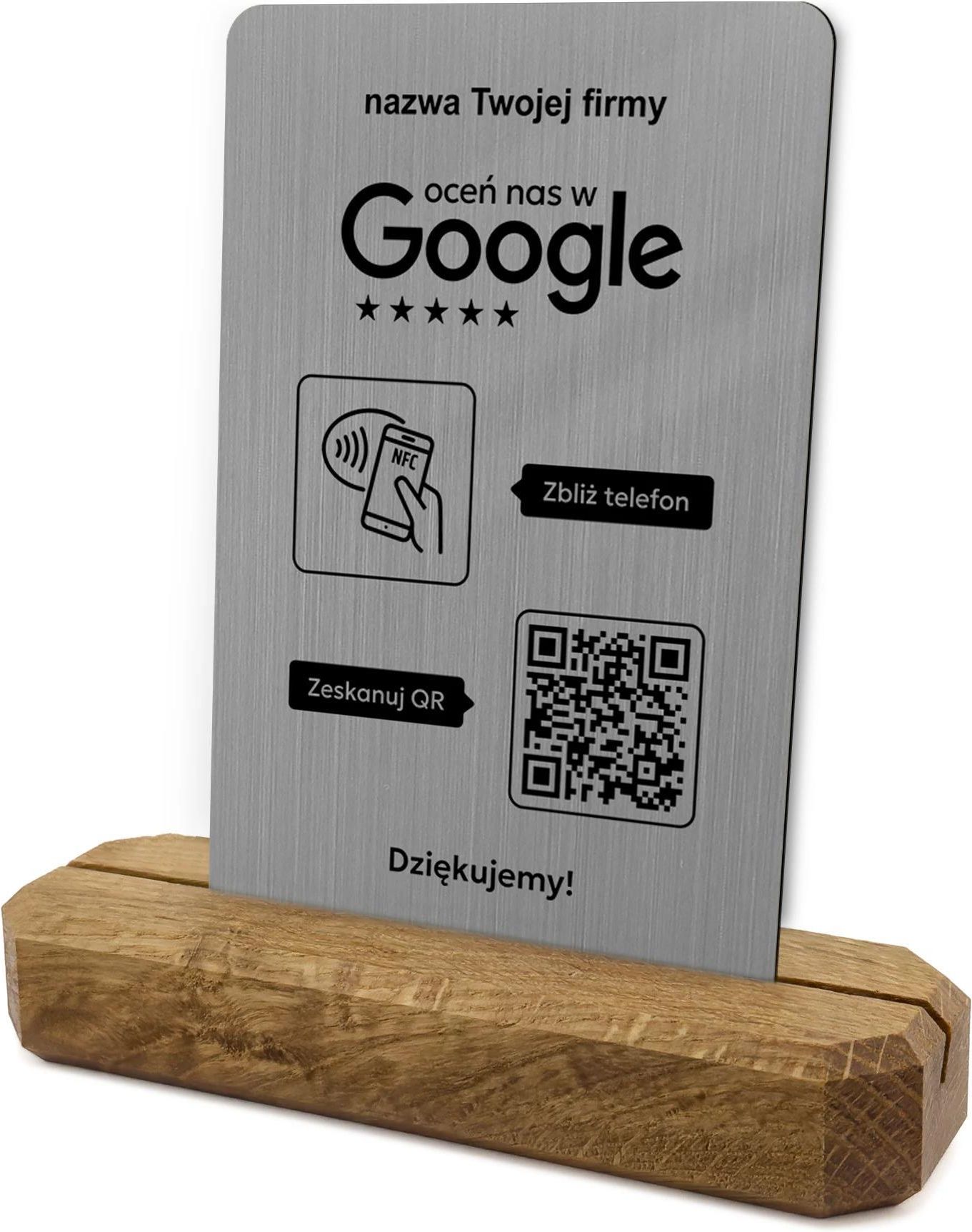 Karta z kodem QR i tagiem NFC na stojaku z litego drewna dębowego do zbierania opinii w Google jest idealnym rozwiązaniem dla Twojej firmy, produktu lub marki, której zależy na profesjonalnym podejściu do gromadzenia feedbacku i podnoszeniu swojej pozycji w wyszukiwarce. Zbieraj błyskawicznie opinie od swoich klientów, bez dodatkowych aplikacji - szybko, prosto i łatwo. Dlaczego warto? Więcej opinii, to lepsze pozycjonowanie Twojej firmy w wyszukiwarce Google. Personalizacja karty - nazwa Twojej firmy. Karta jest kompatybilna z systemami iOS oraz Android. Tag NFC o dużej mocy. Nie wymaga instalowania dodatkowych aplikacji. Stojak z naturalnego drewna dębowego w zestawie. Karta jest aktywna i gotowa do działania od razu po wyjęciu z pudełka - nie musisz dokonywać żadnych procedur aktywacyjnych, ani podawać dodatkowych danych. Dwie technologie: kod QR i tag NFC na jednej karcie sprawiają, że każdy może używać tego, co jest dla niego wygodniejsze. Jak to działa z perspektywy Klienta? To tylko 3 proste kroki. Skanuje kod QR lub zbliża telefon do karty i automatycznie odczytuje tag NFC. Następuje przekierowanie do formularza wystawiania opinii. Wystawia opinię, a ona zapisuje się bezpośrednio na koncie Twojej firmy w Google. Gdzie znaleźć link do formularza wystawiania opinii? Podczas składania zamówienia podaj nam bezpośredni link do wystawiania opinii w Google. Link można znaleźć w sekcji zarządzania firmą w serwisie Google w zakładce: "Poproś o opinię". Link wygląda mniej więcej w ten sposób: g.page/r/UNIKALNE_ID/review W przypadku trudności ze znalezieniem linku - nie przejmuj się, służymy pomocą. Wystarczy, że podasz nam pełną nazwę i adres miejsca dla którego zbierasz opinie Google, a my wygenerujemy Twój unikalny link. Odcień produktu może się delikatnie różnić w zależności od aktualnej dostawy materiałów i kalibracji kolorystycznej Twojego urządzenia. Zdjęcia mają charakter poglądowy, odcień i wzór na elementach drewnianych może się różnić w zależności od aktualnej dostawy drewna. Pamiętaj, że produkt został wykonany z naturalnego drewna, dlatego kolorystyka, usłojenie, niejednolitość jego faktury, czy struktura są unikalne dla każdego egzemplarza. Nasza firma wycina, obrabia i wykańcza materiały na ten produkt we własnym zakresie na najwyższej klasy sprzęcie. W związku z tym, jesteśmy w stanie wykonać jego dowolny rozmiar w zależności od potrzeb i oczekiwań klienta - koszt ustalany jest indywidualnie. Chip NFC: NXP NTAG213 (NFC Forum Type 2 Tag) Materiał (karta): plexi Materiał (podkład): lite drewno dębowe Nadruk: UV Narożniki: zaokrąglone Podkład dębowy: w zestawie Tolerancja wymiarów: +/- 5 mm Typ druku: jednostronny Wymiary (karta): 9.5 cm x 14.5 cm