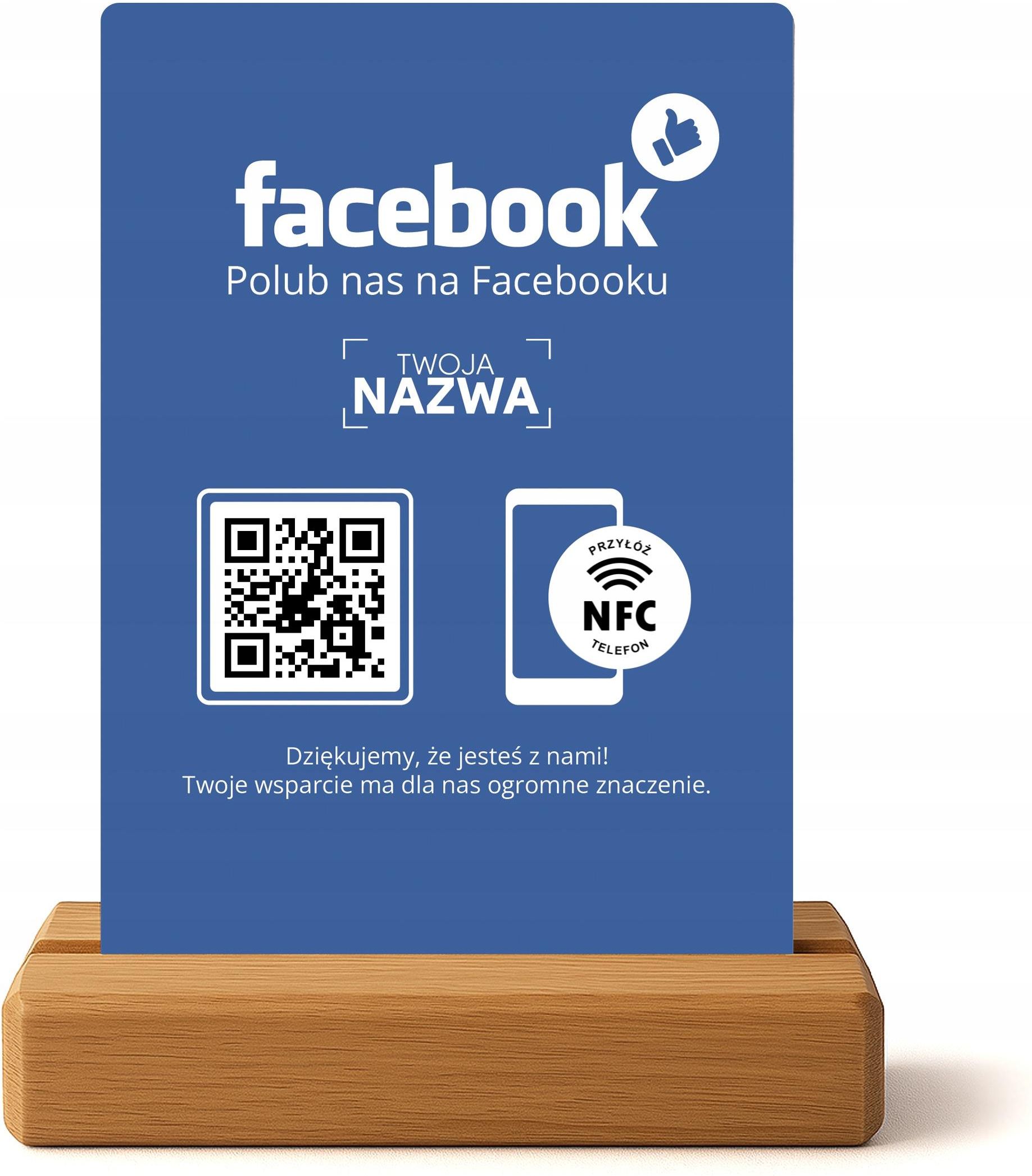 Stand Facebook NFC i QR – stojak / prezenter do polubienia Twojego profilu. Elegancki prezenter z QR i NFC to nowoczesne rozwiązanie, które umożliwia klientom szybkie polubienie i obserwowanie Twojej strony na Facebooku. Wystarczy zbliżyć telefon lub zeskanować kod – bez szukania profilu. NFC + QR = Maksymalna wygoda Tabliczka wyposażona jest w zakodowany chip NFC oraz unikalny kod QR, które automatycznie przekierowują do Twojego profilu. Klient nie musi nic wpisywać – wystarczy dotknięcie lub skan. Zestaw gotowy do działania W komplecie otrzymujesz: tabliczkę z nadrukiem „Polub nas na Facebooku” chip NFC zaprogramowany pod Twój profil kod QR do skanowania drewnianą podstawkę (12 x 4,5 x 2,5 cm) Twoją nazwę na tabliczce Produkt polski = jakość i precyzja Wszystkie elementy wykonujemy lokalnie: projekt, nadruk, kodowanie NFC i QR. Stawiamy na trwałość, estetykę i niezawodność działania. To nie jest masowa produkcja – to dopracowane rozwiązanie. Każdy egzemplarz przygotowujemy na bieżąco – dzięki temu oferujemy błyskawiczną realizację. Personalizacja w cenie W cenie oferty zawarta jest personalizacja: nadruk z Twoją nazwą firmy lub fanpage’a programowanie NFC i kodu QR zgodnie z przesłanym linkiem Wystarczy, że przekażesz nam te dane. Działa natychmiast po rozpakowaniu Tabliczka nie wymaga żadnej konfiguracji – jest gotowa do użycia od razu po rozpakowaniu. Ustaw ją przy ladzie, w recepcji, na stoliku – i obserwuj, jak rośnie liczba polubień! Pomoc i wsparcie Masz pytania, chcesz się upewnić, że wszystko zadziała? Zapewniamy szybki kontakt i pełne wsparcie techniczne przed i po zakupie. Rozpocznij zbieranie opinii już dziś. Zwiększ swoją rozpoznawalność i reputację. Pozwól klientom znaleźć Cię w kilka sekund. Nie zwlekaj – stojak zaczyna działać natychmiast po ustawieniu w Twoim punkcie!