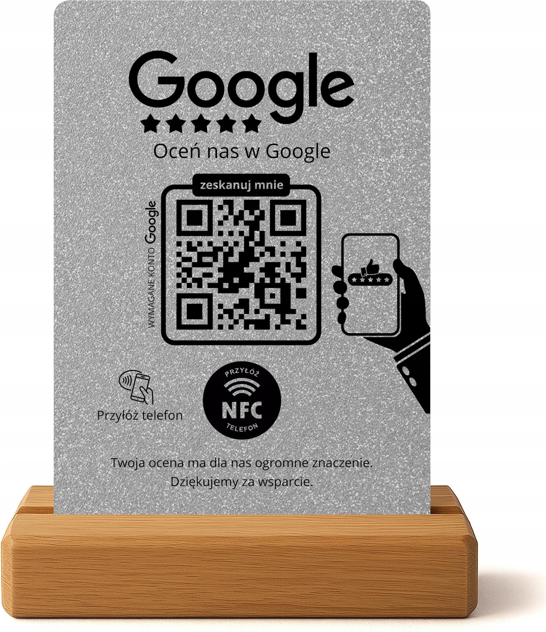 Stojak do opinii Google – wersja premium ze srebrną tabliczką i technologią NFC + QR W dzisiejszym świecie zaufanie klientów buduje się szybciej niż kiedykolwiek. Pozwól, aby Twoi klienci łatwo wystawiali pozytywne opinie – dzięki profesjonalnemu stojakowi do opinii Google z technologią NFC i kodem QR. Bez aplikacji, bez zbędnych komplikacji. Po prostu działa. Jak to działa – krok po kroku Klient przykłada smartfon do tabliczki lub skanuje kod QR. Automatycznie otwiera się strona opinii Twojej firmy w Google. Kilka kliknięć – i opinia dodana! Bez konieczności instalowania aplikacji, bez szukania firmy w wyszukiwarce. Dzięki temu znacząco zwiększasz liczbę opinii i budujesz silniejszą pozycję w Google. Najwyższa jakość wykonania – styl i trwałość Tabliczka o wymiarze A6 z wyraźnym, odpornym na ścieranie nadrukiem. Podstawka z litego, naturalnego drewna dębowego. Całość tworzy elegancką, profesjonalną wizytówkę Twojej firmy. Każdy detal ma znaczenie – zadbaj o to, jak Twoja marka jest postrzegana. Gotowe do działania – bez konfiguracji Nasz stojak jest w pełni zaprogramowany i gotowy do użytku: Chip NFC zawiera link do formularza opinii Kod QR prowadzi do tego samego miejsca Po rozpakowaniu możesz od razu zacząć zbierać opinie – nie potrzebujesz żadnych dodatkowych ustawień. Funkcjonalność i łatwość obsługi Klient zbliża telefon lub skanuje kod Otwiera się gotowy formularz opinii Wystawia ocenę jednym kliknięciem Wszystko trwa mniej niż minutę. Im mniej barier dla klienta, tym więcej opinii! Gdzie najlepiej wykorzystać stojak? Stojak świetnie sprawdzi się w wielu miejscach, m.in.: Recepcje hoteli i pensjonatów Salony kosmetyczne, SPA, fryzjerzy Restauracje, kawiarnie, bary Serwisy samochodowe, warsztaty Biura obsługi klienta Co zawiera zestaw Tabliczkę formatu A6 z trwałym nadrukiem Chip NFC Kod QR Drewnianą podstawkę 12×4,5×2,5 cm Zestaw jest kompletny – wyjmujesz z pudełka i używasz od razu. Dlaczego warto wybrać nasz stojak? Gotowy do działania bez konfiguracji Kompatybilny z systemami iOS i Android Polska produkcja z litego drewna Minimalistyczny i elegancki wygląd Natychmiastowa poprawa widoczności w Google Gwarancja jakości i działania: każdy stojak przechodzi ręczną kontrolę jakości, dzięki czemu masz pewność, że działa z najnowszymi smartfonami i przeglądarkami. Produkt zapewnia szybkie i bezproblemowe wystawianie opinii przez Twoich klientów, co bezpośrednio wpływa na budowanie wizerunku firmy. Produkt polski – pewność wykonania: stojaki produkowane są w Polsce z wysokogatunkowych materiałów. Każdy egzemplarz jest unikalny, co zawdzięczamy naturalnemu usłojeniu drewna, nadającemu każdemu produktowi indywidualny charakter i wysoką estetykę wykonania. Rozpocznij zbieranie opinii już dziś! Dzięki naszemu rozwiązaniu zwiększysz rozpoznawalność i reputację swojej firmy w Google. Stojak zaczyna działać natychmiast po ustawieniu, bez konieczności instalacji aplikacji i bez dodatkowych formalności.