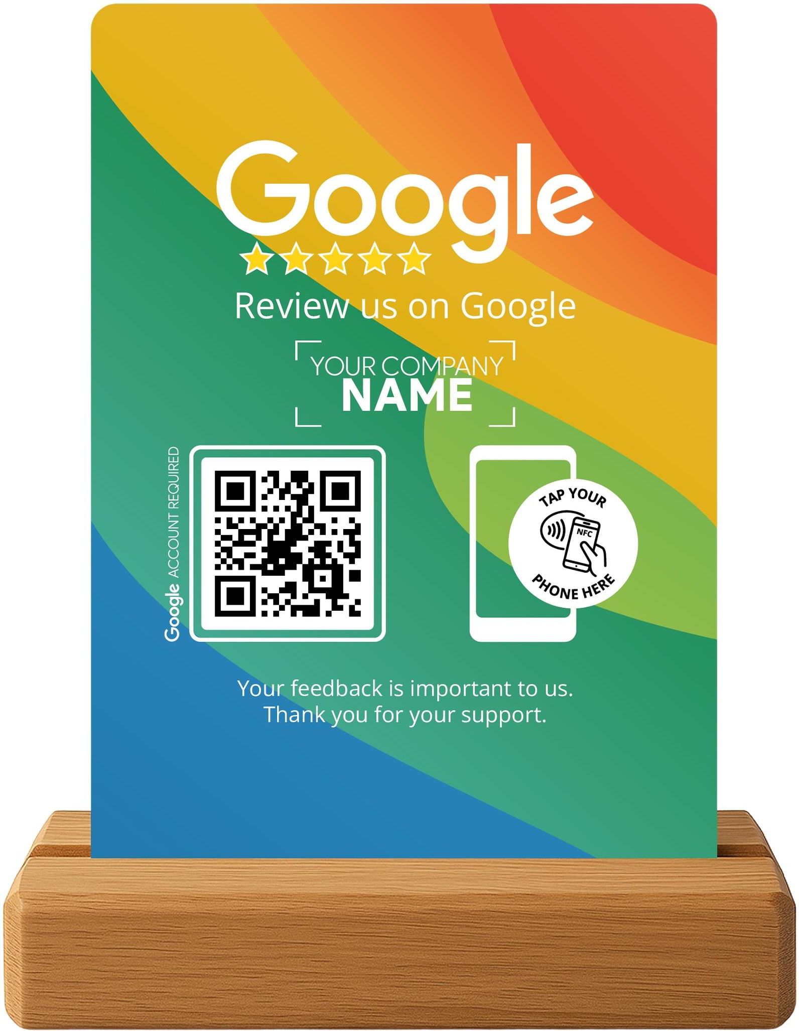 Stojak Google z NFC i QR – personalizowany kolorowy stand z logotypem Twojej firmy (wersja angielska) Nowoczesny stojak do zbierania opinii Google, który łączy technologię NFC, kod QR i wyróżniający się design w kolorach Google. Dodatkowo możesz dodać swoje logo lub nazwę firmy – opcja dostępna …