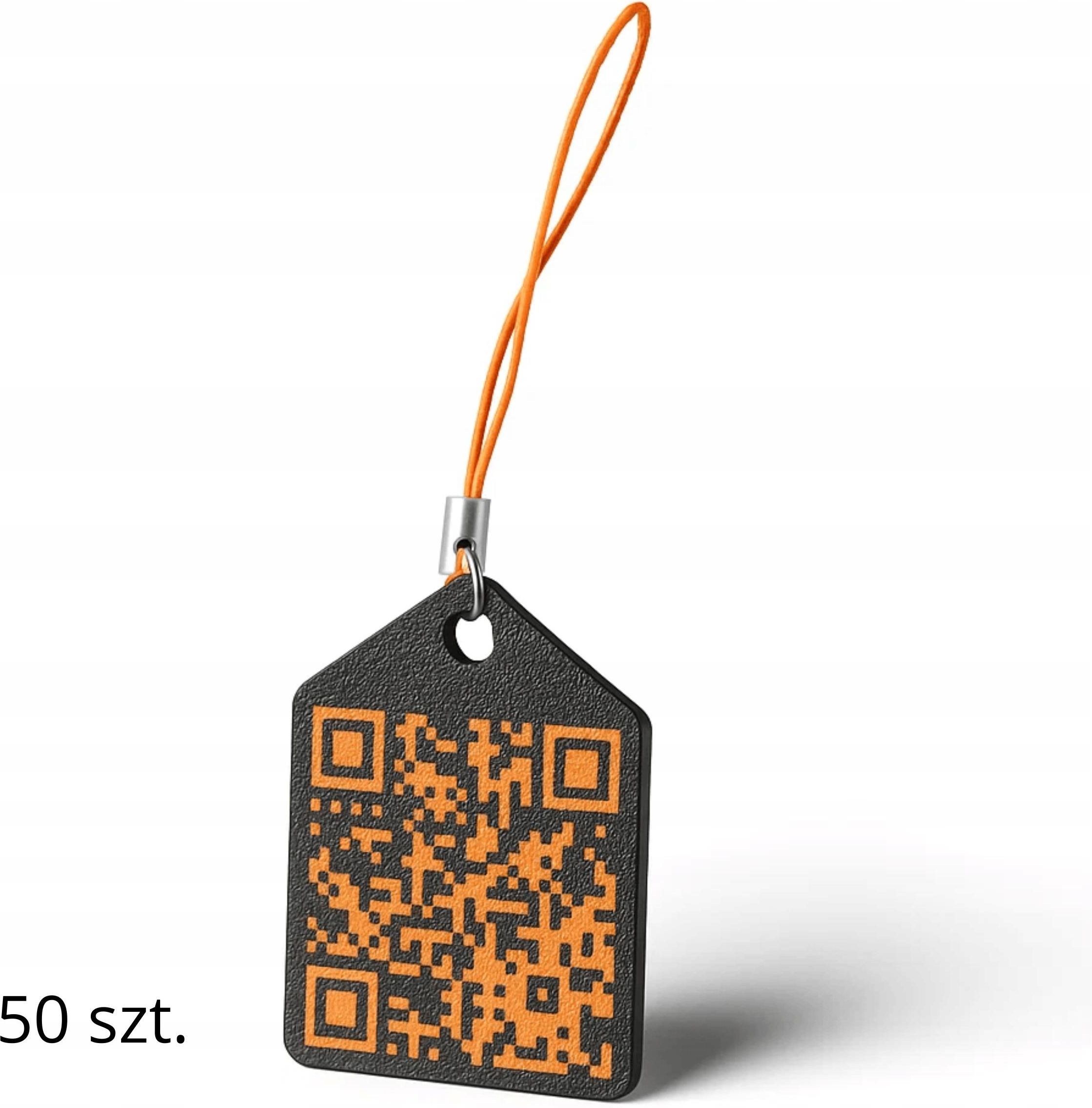 • Zestaw 50 czarnych breloków z pomarańczowym kodem QR