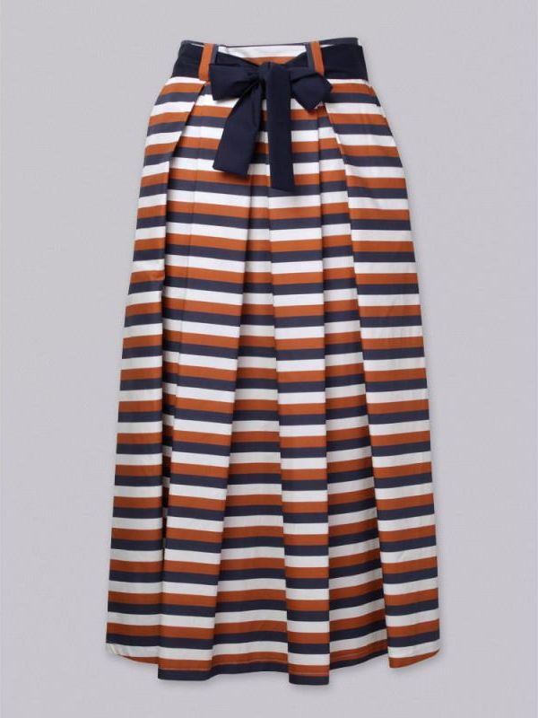 Spódnica rozkloszowana w granatowe, białe i brązowe paski z wysokim stanem, kieszeniami i materiałowym paskiem