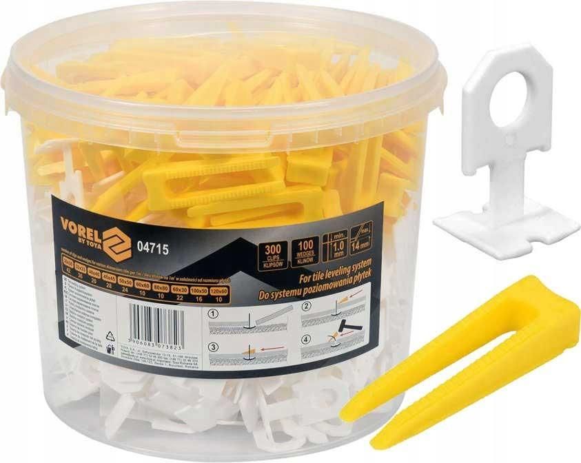 System do poziomowania płytek 1,0mm 100szt klinów i 300szt klipsów w wiaderku VOREL 04715 Nowoczesny system do poziomowania płytek, który w bardzo szybki i łatwy sposób pomaga ułożyć idealnie płytki oszczędzając czas i eliminując niedokładności powierzchni. Składa się z zestawu zrywalnych klipsów oraz klinów wielorazowego użytku, wykonanych z wysokogatunkowego tworzywa sztucznego. Zalety stosowanie systemu VOREL zastępuje wąskie krzyżyki zapobiega przemieszczaniu podczas instalacji i wiązania kleju przyśpiesza układanie płytek z zachowaniem idealnych fug i połączeń brak potrzeby użycia dodatkowych narzędzi można go stosować na ściany i podłogi łatwy w montażu na każdym poziomie umiejętności Przeznaczenie / zastosowanie Do płytek ceramicznych, gresowych, rektyfikowanych podłogowych i ściennych o różnych rozmiarach i grubościach. Służy do poziomowania płytek, Znacznie skraca czas pracy i podnosi wydajność. Stabilizuje położenie Dzięki systemowi uzyskuje się równą powierzchnię bez nadmiernie powtarzającego się poziomowania. Nie ma potrzeby używania dodatkowych narzędzi, nie wymaga wysiłku - jest łatwy w montażu na każdym poziomie umiejętności. proponowany osobom zawodowo układającym kafelki, jak i tym bez doświadczenia. Ilość klinów i klipsów na 1m2 w zależności od rozmiaru płytki: 30 cm x 30 cm - 42 szt 33 cm x 33 cm - 36 szt 40 cm x 40 cm - 20 szt 45 cm x 45 cm - 28 szt 50 cm x 50 cm - 24 szt 60 cm x 60 cm - 10 szt 80 cm x 80 cm - 10 szt 60 cm x 30 cm - 22 szt 100 cm x 50 cm - 16 szt 120 cm x 60 cm - 10 szt Sposób użycia Po nałożeniu kleju włóż klipsy pod kafel tak, aby z każdej strony płytki znalazły się po 2 klipsy Dosuń kolejną płytkę do klipsów. Włóż klin w otwór klipsie i dociśnij aby wyrównać kafelki względem siebie. Po zastygnięciu zaprawy (kleju) do glazury, usuwamy klips lekko go uderzając. Zawartość opakowania kliny - 100 sztuk klipsy - 300 sztuk Parametry Max grubość płytki [mm]: 14 mm Grubość [mm]: 1,0 mm Zastosowanie: Glazura