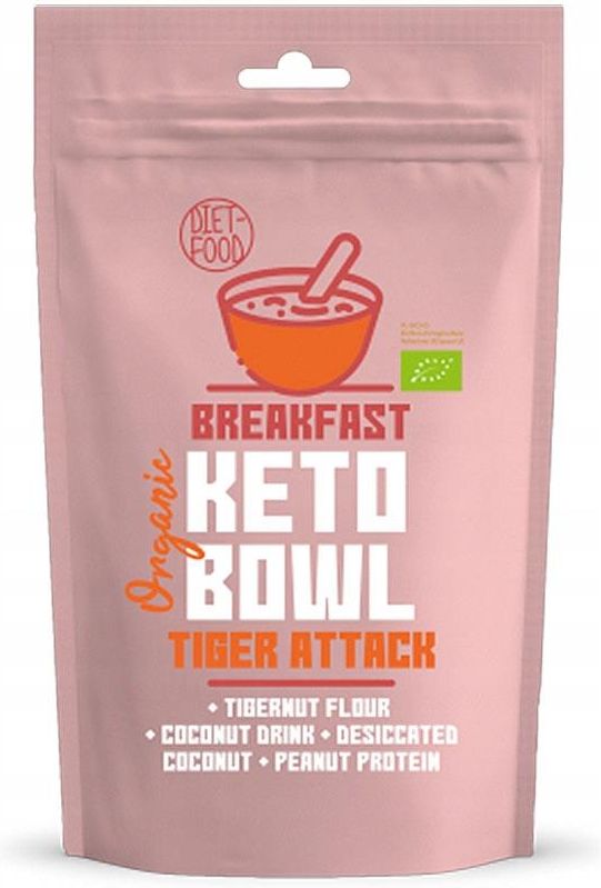 Śniadaniowy Keto Bowl Tiger Attack - 200g - Diet-Food Śniadaniowy Keto Bowl Tiger Attack - 200g - Diet-Food Zamiennik zwykłej owsianki bądź musli, przystosowany dla osób przebywających na diecie ketogenicznej i low-carb! Teraz możesz przygotować szybkie i pyszne śniadanie zaledwie w parę minut. Został wzbogacony o witaminy oraz minerały, dzięki czemu poza świetnym smakiem, jest również zdrową keto przekąską. Skład: bio wiórki kokosowe, bio mąka z orzechów ziemnych, bio napój kokosowy w proszku (97,5% bio napój kokosowy w proszku, 2% bio maltodekstryna-nośnik, 0,5% bio błonnik z akacji-emulgator), bio mąka z migdałów ziemnych 6%, bio erytrytol, bio cynamon, bio imbir. Przechowywać w suchym i chłodnym miejscu. Po otwarciu szczelnie zamknij opakowanie. Produkt może zawierać inne orzechy oraz gluten. Kraj pochodzenia: Polska Wartości odżywczew 100gWartość energetyczna (kJ/kcal)2127 kJ/513 kcalTłuszcz41g- w tym kwasy tłuszczowe nasycone34gWęglowodany19,7g- w tym cukry7gBłonnik12gBiałko17,3gSól0.112g Marka: Diet Food sklad produktu:Skład: bio wiorki kokosowe, bio mąka z orzechów ziemnych, bio napój kokosowy w proszku (97,5% bio napój kokosowy w proszku, 2% bio maltodekstryna-nośnik, 0,5% bio błonnik z akacji-emulgator), bio mąka z migdałów ziemnych 6%, bio erytrytol, bio cynamon, bio imbir. wartosci odzywcze:Wartości odżywczew 100gWartość energetyczna (kJ/kcal)2127 kJ/513 kcalTłuszcz41g- w tym kwasy tłuszczowe nasycone34gWęglowodany19,7g- w tym cukry7gBłonnik12gBiałko17,3gSól0.112g Seria Keto Bowl bazuje wyłącznie na ekologicznych składnikach. Produkty od Diet-Food zostały wzbogacone o witaminy i minerały, dzięki czemu oprócz świetnego smaku są zdrową alternatywą dla chipsów i innych niezdrowych przekąsek. Dostarczają porannej energii tak niezbędnej do codziennego prawidłowego funkcjonowania organizmu.