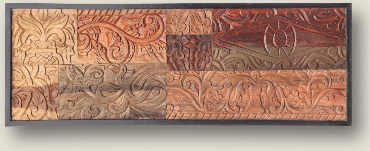 Dekoracja ścienna z tekowego drewna o bogatej palecie naturalnych odcieni. Ta unikatowa ozdoba łączy w sobie tradycyjne rzemiosło i nowoczesny design. Ręcznie rzeźbione panele z drewna tekowego tworzą harmonijną mozaikę bogatych wzorów i różnorodnych faktur, które przyciągają wzrok i wprowadzają do wnętrza naturalny charakter. Każdy fragment ramy opowiada swoją historię, emanując ciepłem i egzotycznym urokiem. Dekorację można zawiesić zarówno w pionie, jak i w poziomie, co pozwala na dopasowanie jej do różnych przestrzeni – od salonu po przedpokój. To nie tylko element aranżacji, ale także wyjątkowa opowieść o harmonii między naturą a sztuką. Zainspiruj się jej niepowtarzalnym stylem i wprowadź odrobinę egzotyki do swojego domu. Idealna dla miłośników oryginalnych akcentów i ponadczasowego piękna. Wymiary: szer. 125 cm, gł. 4 cm, wys. 44 cm.Materiał: drewno tekowe.Waga: 6 kg.