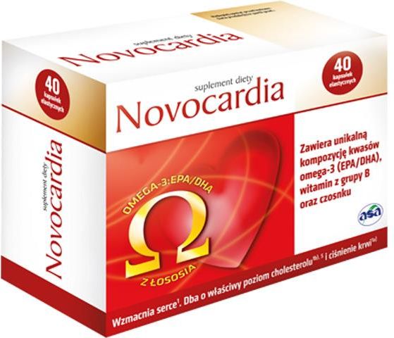 Novocardia suplement diety to innowacyjny preparat, który dostarcza cennych dla zdrowia serca i układu krążenia niezbędnych nienasyconych kwasów tłuszczowych omega-3 (EPA i DHA) we właściwych proporcjach, witamin przyjaznych sercu oraz czosnku. Stworzony został z myślą o osobach, które chcą aktywnie zadbać o swoje zdrowie, serce i układ krążenia. Dodatkowo w preparacie zawarty jest bezzapachowy czosnek oraz witaminy z grupy B. Składniki: Olej rybi (składnik pochodzący z ryb), żelatyna (otoczka kapsułki, substancja pomocnicza), glicerol (nośnik, substancja dodatkowa), witamina E (jako octan DL-alfa-tokoferylu, co stanowi ekwiwalent 2,3 mg alfa-tokoferolu), tlenki żelaza (barwnik substancja dodatkowa), macerat z czosnku standaryzowany na zawartość allicyny, witamina B6 (jako chlorowodorek pirydoksyny), kwas foliowy (jako kwas pteroilomonoglutaminowy), witamina B12 (jako cyjanokobalamina). Składniki 1 kapsułka % RDA 3 kapsułki % RWS Olej rybi, w tym: 1000 mg -- 3000 mg -- - kwas eikozapentaenowy (EPA) 180 mg -- 540 mg -- - kwas dokozaheksaenowy (DHA) 120 mg -- 360 mg -- Witamina E 3,4 mg 28,3% 10,2 mg 85% Czosnek 1,34 mg -- 4 mg -- Witamina B6 0,67 mg 48% 2 mg 143% Kwas foliowy 67 mcg 33% 200 mcg 100% Witamina B12 0,35 mcg 14% 1 mcg 42% RWS - zalecane dzienne spożycie. Właściwości: Właściwości niektórych składników Kwas dokozaheksaenowy (DHA) - przyczynia się do prawidłowego funkcjonowania serca, utrzymania prawidłowego funkcjonowania mózgu i prawidłowego widzenia, Kwas eikozapentaenowy (EPA) - przyczynia się do prawidłowego funkcjonowania serca, Foliany - pomagają w prawidłowej syntezie aminokwasów i produkcji krwi oraz utrzymaniu prawidłowego metabolizmu homocysteiny; przyczyniają się do wzrostu tkanek matczynych w czasie ciąży, Witamina A - przyczynia się do utrzymania prawidłowego metabolizmu żelaza i właściwego stanu błon śluzowych, pomaga w utrzymaniu prawidłowego widzenia i zdrowej skóry, a także w prawidłowym funkcjonowaniu układu odpornościowego, Witamina D - pomaga w prawidłowym wchłanianiu i wykorzystywaniu wapnia i fosforu, w utrzymaniu prawidłowego poziomu wapnia we krwi oraz utrzymaniu zdrowych mięśni, kości i zębów. Przeciwwskazania: Nadwrażliwość na którykolwiek ze składników preparatu. W okresie ciąży i karmienia piersią przed zastosowaniem należy skonsultować się z lekarzem lub farmaceutą. Zalecane spożycie: Doustnie 1-3 kapsułki dziennie. Zaleca się przyjmowanie preparatu w trakcie posiłku. Ważne informacje: Nie należy przekraczać zalecanej porcji do spożycia w ciągu dnia. Suplement diety nie może być stosowany jako substytut (zamiennik) zróżnicowanej diety ani aktywnego trybu życia. Utrzymanie prawidłowego stanu zdrowia wymaga zrównoważonego i zróżnicowanego odżywiania i prowadzenia zdrowego trybu życia. Istnieje wiele czynników ryzyka choroby. Zmiana jednego z tych czynników ryzyka może wywierać korzystny wpływ lub nie wywierać go. Przechowywać w sposób niedostępny dla małych dzieci w temperaturze pokojowej. Pojemność opakowania: 40 kapsułek Producent: ASA Sp. z o.o. Oświęcimska 11 48-100 Głubczyce