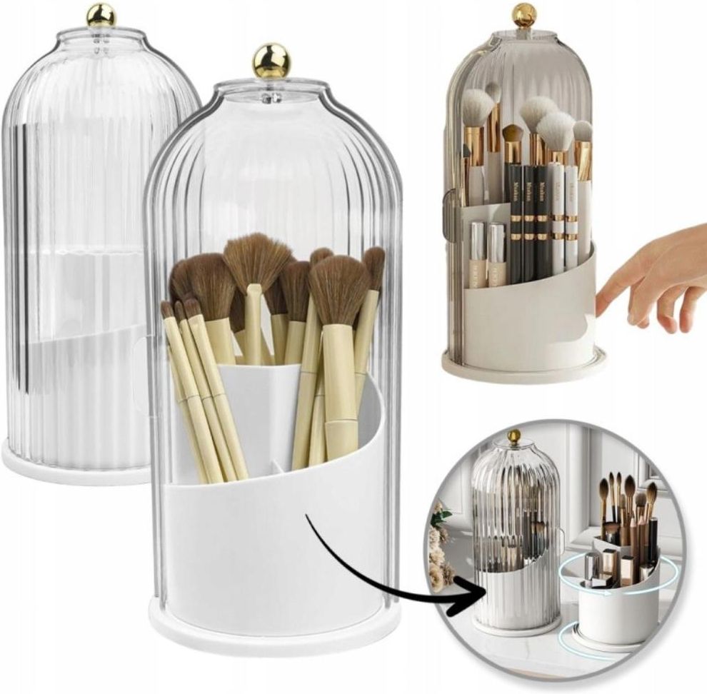 Ryflowany Pojemnik Organizer Na Pędzle Obrotowy Otwierany Biały 27 x 12cm Elegancki organizer na pędzle dp makijażu Funkcjonalne rozwiązanie, które pozwoli utrzymać porządek w Twojej kolekcji pędzli do makijażu. Jest wyjątkowo elegancki i będzie służył również jako dekoracja pomieszczenia. Pozwoli zachować ład i porządek w kosmetykach, czy podręcznych drobiazgach. Ryflowana struktura wnętrza organizera utrzymuje pędzle w pionie, minimalizując ryzyko zgniecenia włosia czy uszkodzenia końcówki. Każdy pędzel ma swoje wyznaczone miejsce, co ułatwia utrzymanie porządku. Organizer wykonany z łatwego do czyszczenia materiału, nasz organizer utrzymuje się w nienagannej czystości. Wystarczy krótka chwila, aby odświeżyć i przywrócić mu pierwotny blask. Specyfikacja produktu idealny pojemnik do łazienki, garderoby czy sypialni organizer przeznaczony do przechowywania pędzli, kosmetyków obrotowy - obraca się o 360 stopni transparentny front, dzięki czemu szybko odnajdziesz potrzebną rzecz chroni pędzle przez zabrudzeniem czy kurzem materiał: tworzywo sztuczne.