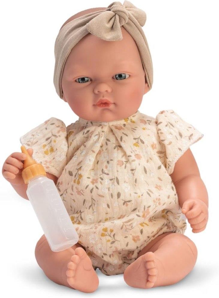 Lalka hiszpańska Oli z butelką Asi 0457740 30 cm Wyjątkowa lalka hiszpańska Asi 0457740 posiada miękki brzuszek, uszyty z tkaniny i wypełniony naturalnymi włóknami kapokowymi. Rączki, nóżki oraz główka wykonana z miękkiego winylu, który jest gładki i przyjemny w dotyku. Bobas ma 30 cm wysokości. Oli ma duże ręcznie malowane niebieskie, stale otwarte oczy. Lalka nie posiada rzęs, a brwi są delikatnie zarysowane. Na główce włoski są wyrzeźbione tak, aby przypominały niemowlęce. Bobas w oryginalnie zaprojektowanym outficie przeznaczony jest do zabawy dla dzieci powyżej 3 roku życia. Poznaj szczegóły wyglądu lalki hiszpańskiej ASI Oli! Bobas o imieniu Oli ma uroczą buzię, błyszczące, malutkie usta, zaróżowione policzki oraz drobne dłonie. Wyrzeźbione dołeczki na piąstkach i fałdki przy kolanach czy też podkreślone rysy twarzy sprawiają, że wygląda on jak niemowlę. Lalka hiszpańska ubrana jest w jasnobeżowego rampersa z bufiastymi rękawkami, uszytego ręcznie z wysokiej jakości miękkiej tkaniny w delikatny kwiatowy wzór. Zapięcie na rzep ułatwia dziecku przebieranie bobasa. Outfit uzupełnia elastyczna opaska wiązana na kokardę. Zabawę w troskliwą mamusię uatrakcyjnia dołączona do zestawu butelka, którą można napełnić wodą. Lalka hiszpańska z miękkim brzuszkiem - wymarzony upominek dla dziewczynki Śliczna lalka hiszpańska w jakości premium zapakowana jest w eleganckie firmowe pudełko z wieczkiem, opatrzone oryginalnym logo marki Asi. Zabawka została zaprojektowana i ręcznie wykonana w Hiszpanii. Posiada wszystkie wymagane certyfikaty bezpieczeństwa CE. OSTRZEŻENIE! Nieodpowiednie dla dziecka poniżej 3 roku życia. Małe części. Zgodne europejskimi normami bezpieczeństwa CE. Produkt oryginalny, jego kopiowanie jest zabronione. Zachowaj oryginalne opakowanie jako dowód pochodzenia produktu. UWAGA. Przed oddaniem zabawki dziecku należy usunąć i wyrzucić wszystkie zabezpieczenia. Kolory, wzory, zawartość produktu mogą się różnić.