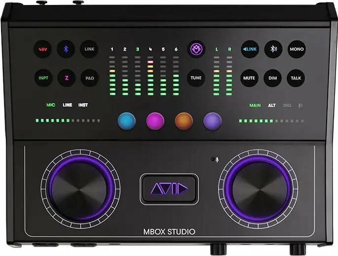 USB-C 2.0 Audio Interface Integrated high-impedance re-amping output with ground lift for flexible guitar recording Two-channel effect loop with switchable output impedance Additional Bluetooth stereo input and output With max. resolution 24 bit / 192 kHz and up to 21 inputs and 22 outputs 4 High-quality combined preamps for microphone and instrument signals with variable input impedance Switchable +48 V phantom power, -10 dB pad, phase inversion and high-pass filter Complete monitor control with 2 stereo monitor paths, 2 individually adjustable stereo headphone outputs and source selection as well as integrated talkback microphone 2 Large rotary controls with push-button function for gain and volume as well as push-buttons for basic channel and monitoring functions provide instant access to all important parameters DSP-based monitor mixer with switchable soft limiter and parametric 4-Band channel EQ per input, plus reverb and delay 4 Buttons and 2 footswitch connections for user-definable functions, plus start button for Mbox Control application Ergonomic metal desktop enclosure with Kensington security lock MIDI input and output: 5-pin DIN connector 2 Footswitches / foot pedal inputs: 6.3 mm TRS jack Dimensions (W x D x H): 288 x 225.3 x 105.2 mm Weight: 2.8 kg Analogue inputs: 4x Combo input (XLR / 6.3 mm jack balanced) 4x Line / Fx return input (6.3 mm jack balanced) Max. input level: 14 dBu, gain range: 60 dB, dynamic range: 112 dB (Mic / Line), 108 dB (Instr), THD+N: 0.001 % (Mic / Line), 0.004 % (Instr), ON mic input: -129 dB (A-weighted), frequency response: 20 Hz to 20 kHz, ? 0.125 dB Analogue outputs: 4x Monitor output (6.3 mm jack balanced) 2x Line / FX send output (6.3 mm jack balanced) Max. output level: 19 dBu, dynamic range: 110 dB (monitor / line), 103 dB (Hi-Z), THD+N: 0.0012 % (monitor), 0.002 % (line, Hi-Z), frequency response: 20 Hz to 20 kHz, ? 0.125 dB (line, monitor), ? 0.3 dB (Hi-Z) 2 Headphone outputs: 6.3 mm jack stereo Dynamic range: 102 dB, frequency response: 20 Hz to 20 kHz, ? 0.2 dB, output power: 120 mW > 32 Ohm Digital inputs: Optical input (8 channels ADAT or 2 channels S/PDIF) Coaxial S/PDIF output Bluetooth with forwarding to MBox Control Digital outputs: Optical output (8 channels ADAT or 2 channels S/PDIF) Coaxial S/PDIF input Bluetooth Scope of delivery: MBOX Studio USB interface USB-C cable USB-C socket to USB-A plug adapter Power adapter 12 V DC Registration card Pro Tools Studio Annual Subscription (one-year licence) Sibelius Artist Annual Subscription (one-year licence) Ignition Pack 3 MBOX Control application Printed, multilingual Quick Start Guide Important note: You can test the product without product registration for a period of 30 days without any restrictions. For this purpose, please download a 30-day test version of the required software: https://my.avid.com/get/pro-tools-ultimate-trial. If you register the product provided for the product after delivery and before expiry of the revocation period, you have no right of revocation (cf. also ? 3.3. of our GTC). Furthermore, you are not entitled to a money-back guarantee for the 16 days remaining after the expiry of the withdrawal period, provided that you do the product registration intended for the product within the money-back period (see also ? 4.5. of our GTC).