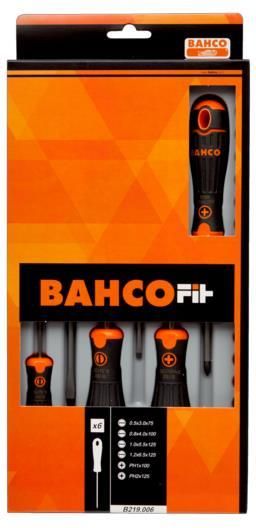 Komplet wkrętaków BAHCOFIT Bahco [B219.006]: pionowe żłobienia antypoślizgowe na dwukomponentowej rękojeści zapewniają wygodę użytkowania i pewny chwyt, oznaczenia na rękojeści (numer seryjny i rodzaj końcówki wybity laserowo) ułatwiają identyfikację rozmiaru i rodzaju wkrętaka, końcówka wykonana z wysokiej jakości stali stopowej, pokryta chromem w całości utwardzona i czerniona, w rękojeści znajduje się otwór do zawieszenia, wkrętaki zostały wyprodukowane zgodnie z normą ISO 2380/DIN 5264, dzięki najwyższej jakości rękojeści i grotu wkrętaki sprawdzą się doskonale w zastosowaniach przemysłowych, zestaw wkrętaków zapakowany w kartonie o wymiarach 38 x 175 x 365mm, waga zestawu: 450 g Skład zestawuwkrętaków Bahco [B219.006]: 4 wkrętaki do śrub płaskichw rozmiarach: - 1 x 5,5 x 125mm [B190.055.125], - 1,2 x 6,5 x 125mm [B190.065.125], - 0,5 x 3 x 75mm [B191.030.075], - 0,8 x 4 x 100mm [B191.040.100] 2 wkrętaki do śrub krzyżowych typu Philips: - PH1 x 100mm [B192.001.100], - PH2 x 125mm [B192.002.125]