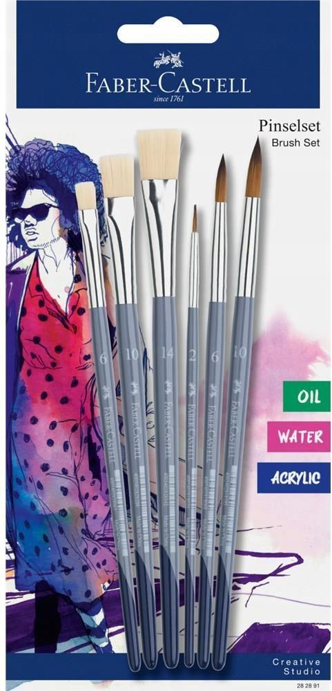 Zestaw pędzelków Creative Studio Faber-Castell z okrągłymi i płaskimi końcówkami Idealne do pracy z kredkami i farbami akwarelowymi oraz kolorami rozpuszczalnymi w wodzie. W drewnianej obudowie. Gwarantują doskonałe uwalnianie koloru. Włosie jest szybkoschnące i nie osypuje się. Odpowiednie do wielu technik malarskich i stylów artystycznych. Zestaw zawiera pędzle z okrągłą końcówką w rozmiarach: 2, 6, 10 i pędzle z płaską końcówką w rozmiarach: 6, 10, 14.