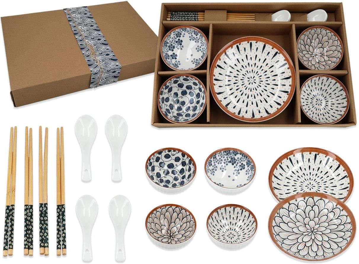 Zorganizuj wieczór w klimacie kultury orientalnej – zapal kadzidełka i podaj swoim gościom sushi na specjalnym porcelanowym zestawie w stylu japońskim. Porcelanowy zestaw do sushi składający się z 14 elementów. Naczynia o kremowym odcieniu bieli zdobione są orientalnym wzorem oraz delikatnym tłoczeniem po zewnętrznej stronie. Zestaw dla 4 osób, który zawiera 4 komplety pałeczek, 4 porcelanowe łyżki, 2 talerze oraz 4 miseczki o pojemności całkowitej około 260 ml (pojemność liczona po rant miseczki). Komplet wygodny w użytkowaniu i prosty w utrzymaniu czystości. Można go swobodnie myć w zmywarce oraz używać w kuchence mikrofalowej, co ułatwi codzienne użytkowanie i zaoszczędzi nasz cenny czas. Całość zapakowana w ozdobne pudełko to doskonały pomysł na niebanalny prezent urodzinowy dla miłośników dobrego japońskiego jedzenia i nie tylko. Wzór: 846-3213 Produkt 4 x zestaw pałeczek 4 x miseczka 2 x talerz 4 x łyżka 1 x ozdobne opakowanie Wymiary talerzyk: średnica: 20,3 cm, h 4 cm miseczka: średnica 11,3 cm, h 6 cm, poj. około 260 ml długość pałeczek: 22,5cm łyżka: długość 13,8 cm, szerokość 4,2 cm wymiary pudełka: 46,5cm x 30,5 cm x h7,5 cm Materiał porcelana Użytkowanie dopuszczone do kontaktu z żywnością do zmywarki do mikrofali