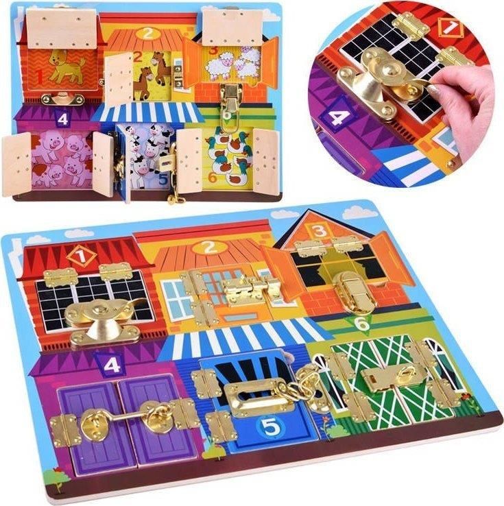 Tablica sensoryczna manipulacyjna zamki ZA4133 CO WYRÓŻNIA NASZ PRODUKT 1✔️Wszechstronny rozwój dziecka poprzez naukę liczenia, rozpoznawanie kolorów i kształtów oraz ćwiczenie zdolności manualnych. Angażująca zabawa z sześcioma drzwiczkami wyposażonymi w różnorodne zamki i ukrytymi zwierzątkami, …