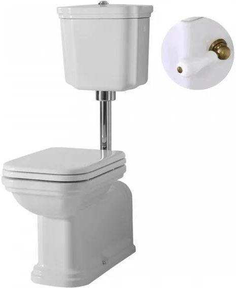 Miska do kompaku - odpływ : uniwersalny - wersja bez kołnierza wewnętrznego : nie - sposób montażu: do posadzki - kolor : biały Dolnopłuk - uruchamienie : z boku - dopływ wody : z boku - kolor : biały Rura spłukująca do dolnopłuku - łączy zbiornik z miską WC - materiał : mosiądz - kolor : stare złoto Mechanizm spłukujący - uruchamienie : z boku - kolor przycisku : stare złoto Do kompletowania z deską