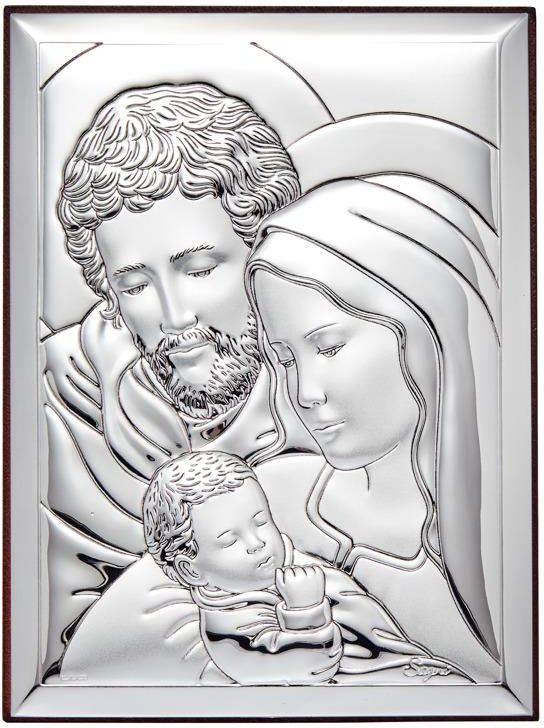 Obrazek srebrny z wizerunkiem Świętej Rodziny to obraz zjednoczenia (komunii) Świętych Osób. Jednocześnie obraz ten wyraża zjednoczenie, miłość, życie małżeństwa i rodziny chrześcijańskiej, która dąży do świętości i do tworzenia komunii we własnym małżeństwie i rodzinie, dzięki czemu jest to doskonały prezent na ślub czy narodziny dziecka. Obrazek wyprodukowany został przez firmę LAR International. Gwarantuje ona, iż przedmiot nabyty przez Państwa został wyprodukowany we Włoszech, z metalu pokrytego czystym srebrem w technologii PVD. Dzięki temu jest odporniejszy na odkształcenia mechaniczne i śniedzenie, doskonale odbija światło, co podkreśla szlachetność srebra. Obrazek zabezpieczony jest warstwą lakieru, która chroni przed czynnikami zewnętrznymi. Wpływa to na bezproblemowe użytkowanie bez potrzeby częstego czyszczenia. Obrazek z wizerunkiem Świętej Rodziny można zarówno powiesić, jak i postawić na dołączonej podstawce. Do czyszczenia zalecamy używanie wyłącznie czystych, miękkich ściereczek, a w przypadku zabrudzeń letniej wody. Nie należy stosować detergentów, alkoholu ani znajdujących się w sprzedaży środków i ściereczek do czyszczenia srebra, gdyż mogą one uszkodzić warstwę ochronną.